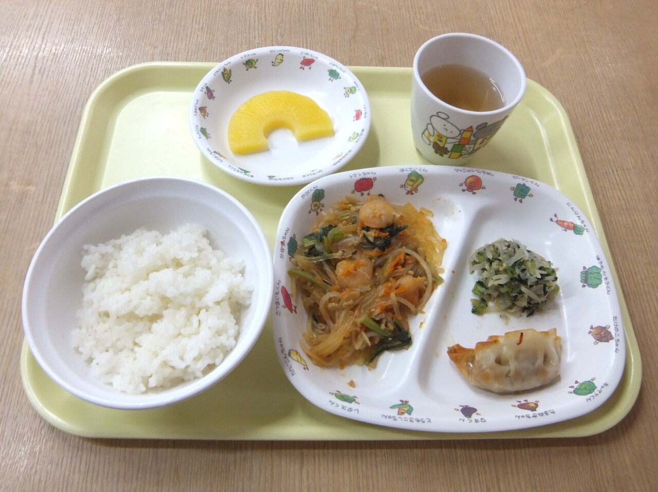 HOME 園の様子 毎日の給食とおやつ 毎日の給食とおやつ 2025/09/29 ☆今日の給食 ・ごはん ・春雨とエビの中華炒め ・焼き餃子 ・もやしのナムル ・パイン ・麦茶☆3時のおやつ ・マカロニきな粉 ・牛乳 今日の給食 3時のおやつ BACK HOME