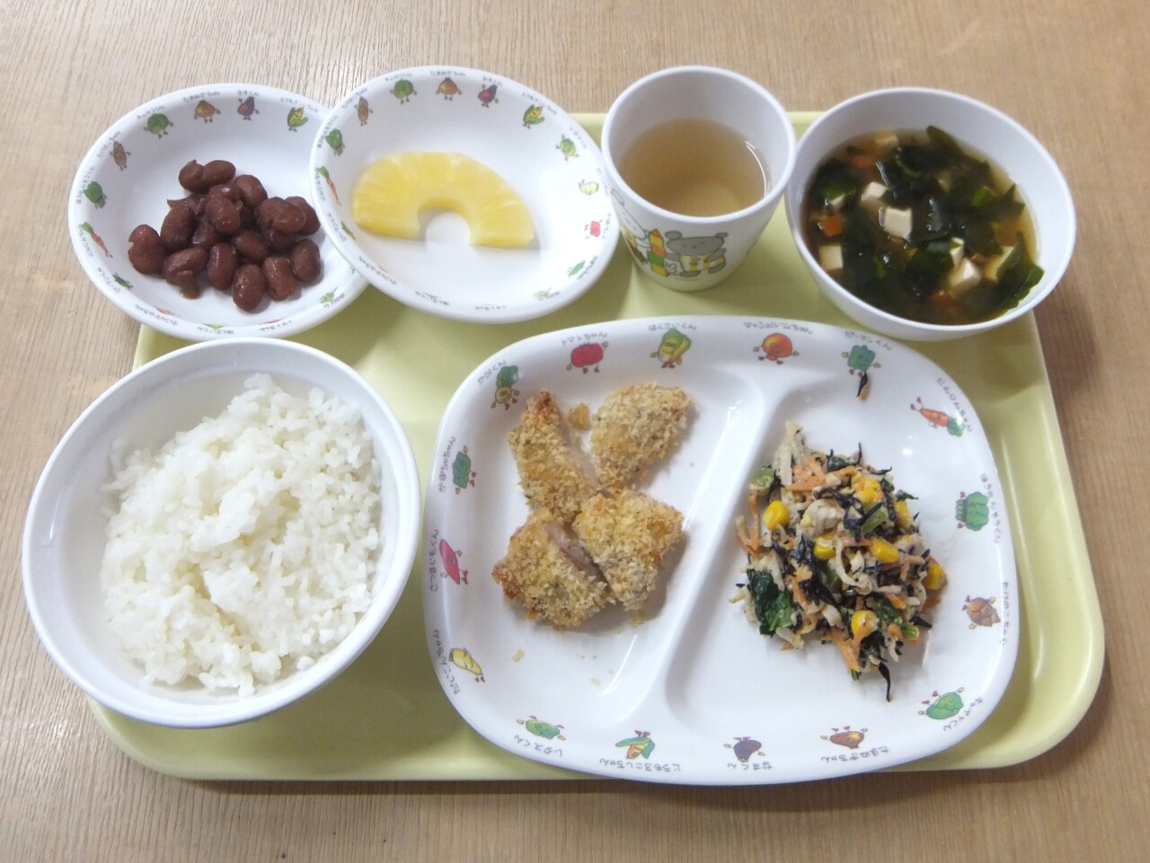 HOME 園の様子 毎日の給食とおやつ 毎日の給食とおやつ 2025/10/16 ☆今日の給食 ・ごはん ・鶏肉のパン粉焼き ・金時煮豆 ・切干大根サラダ ・味噌汁 ・パイン ・麦茶☆3時のおやつ ・せんべい ・牛乳 今日の給食 3時のおやつ BACK HOME