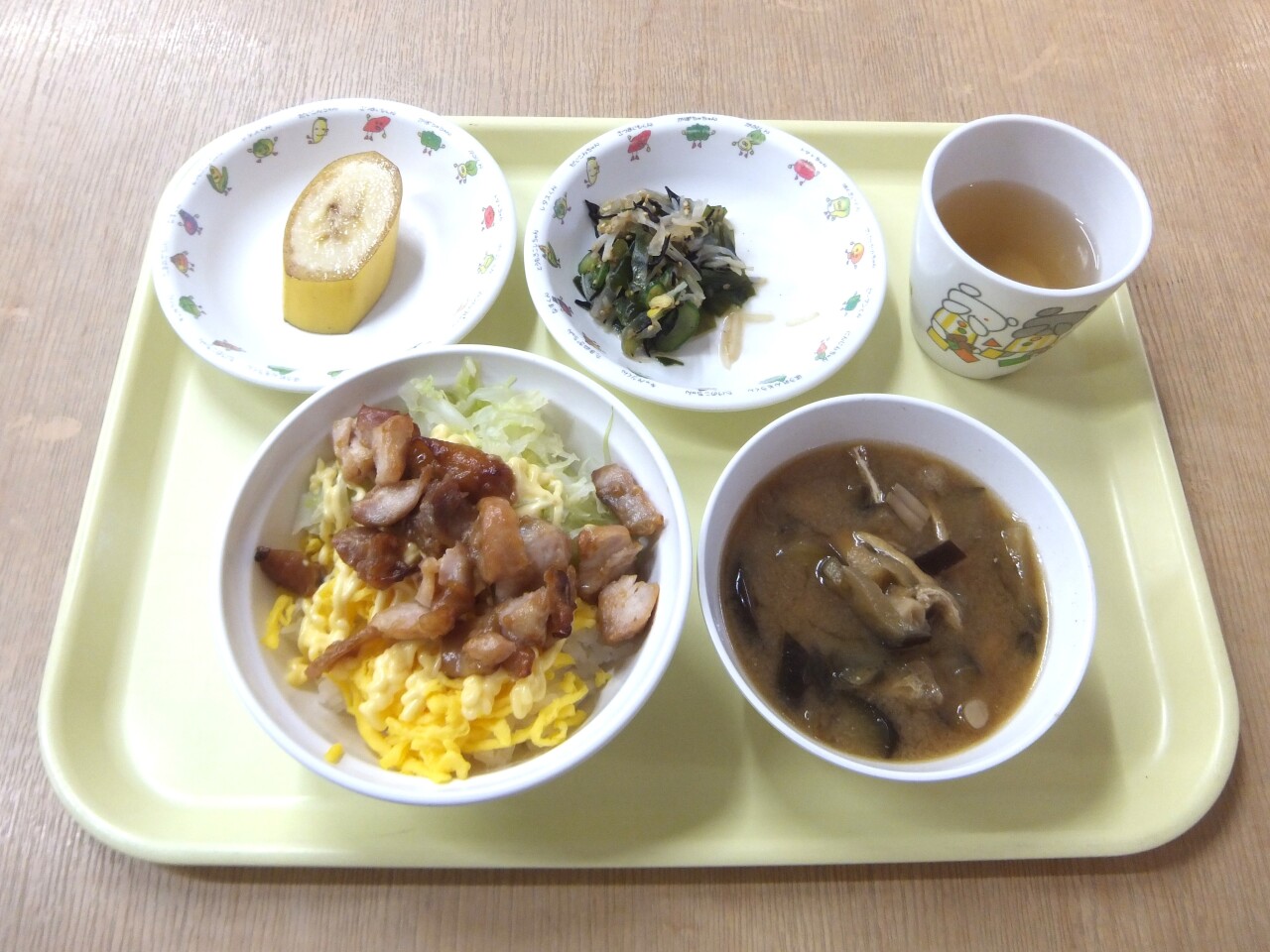 HOME 園の様子 毎日の給食とおやつ 毎日の給食とおやつ 2025/10/21 ☆今日の給食 ・照り焼きチキン丼 ・海藻サラダ ・なすの味噌汁 ・バナナ ・麦茶☆3時のおやつ ・トマトチーズ蒸しパン ・乳飲料(低脂肪) 今日の給食 3時のおやつ BACK HOME