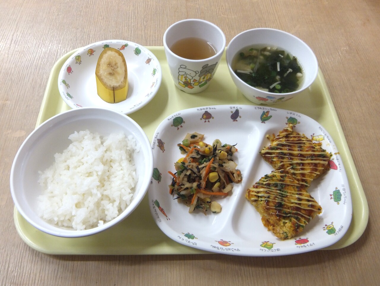 HOME 園の様子 毎日の給食とおやつ 毎日の給食とおやつ 2025/11/12 ☆今日の給食 ・ごはん ・お好み焼き風ミートローフ ・切干大根サラダ ・わかめスープ ・バナナ ・麦茶☆3時のおやつ ・マカロニきな粉 ・牛乳 今日の給食 3時のおやつ BACK HOME