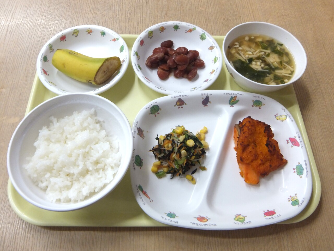 HOME 園の様子 毎日の給食とおやつ 毎日の給食とおやつ 2025/11/18 ☆今日の給食 ・ごはん ・魚の紅葉焼き ・金時煮豆 ・青菜のひじき和え ・豆腐とわかめの味噌汁 ・バナナ ・麦茶☆3時のおやつ ・せんべい ・乳飲料(低脂肪) 今日の給食 3時のおやつ BACK HOME