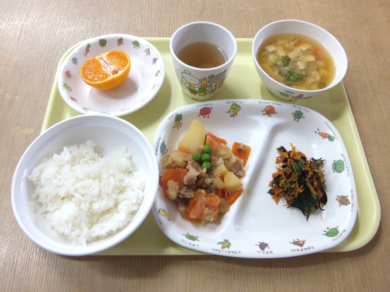 HOME 園の様子 毎日の給食とおやつ 毎日の給食とおやつ 2025/11/25 ☆今日の給食 ・ごはん ・肉じゃが ・ほうれん草のおかか和え ・豆乳味噌汁 ・みかん ・麦茶☆3時のおやつ ・サクサクごまクッキー ・牛乳 今日の給食 3時のおやつ BACK HOME
