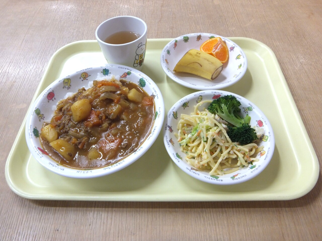 HOME 園の様子 毎日の給食とおやつ 毎日の給食とおやつ 2025/12/25 ☆今日の給食 ・カレーライス ・スパゲッティーサラダ ・バナナ、みかん ・麦茶☆3時のおやつ ・ココア蒸しパン ・乳飲料(低脂肪) 今日の給食 3時のおやつ BACK HOME