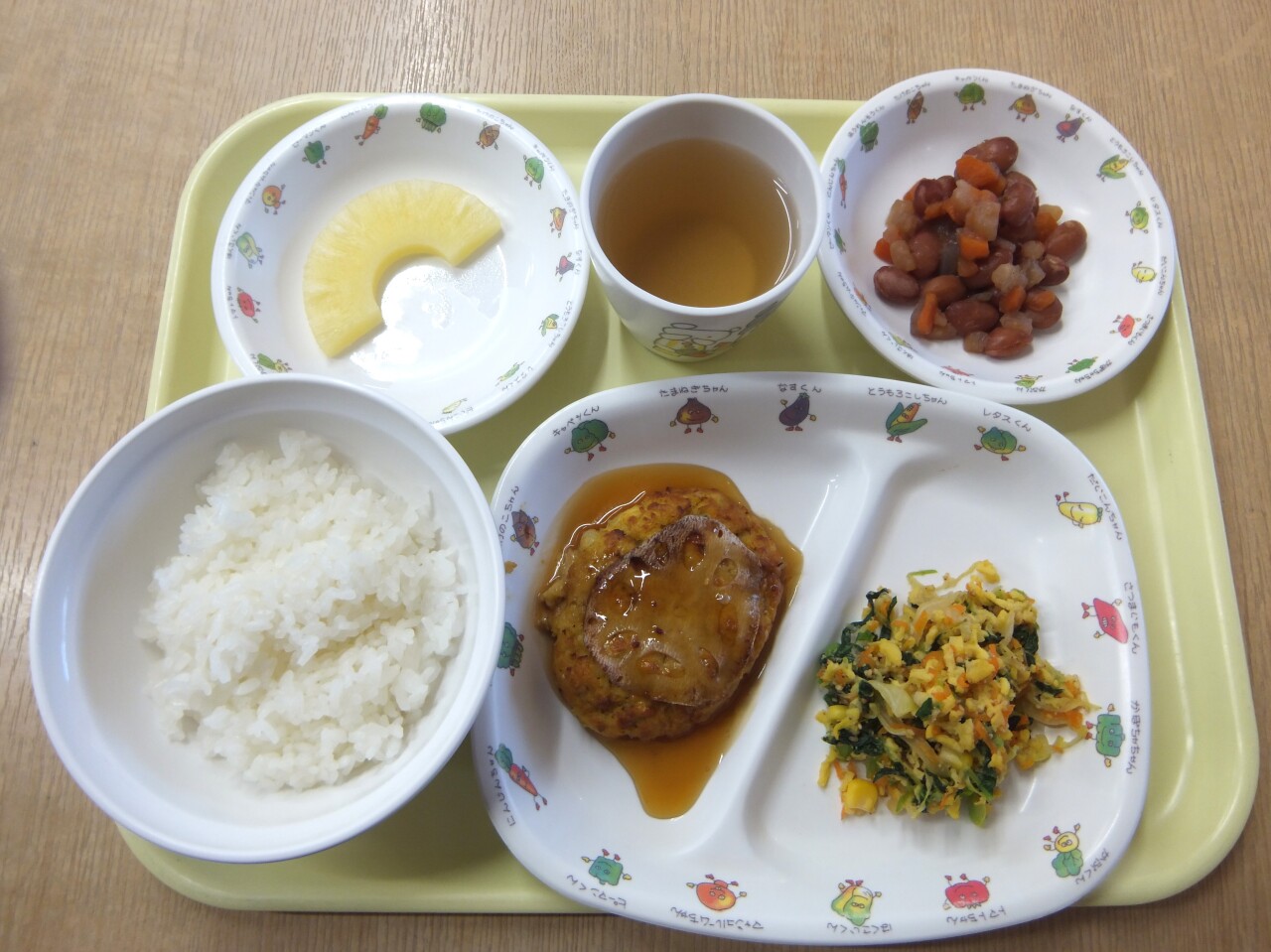 HOME 園の様子 毎日の給食とおやつ 毎日の給食とおやつ 2026/01/07 ☆今日の給食 ・ごはん ・れんこんハンバーグ ・金時煮豆 ・青菜の錦糸和え ・パイン ・麦茶☆3時のおやつ ・七草リゾット ・乳飲料(低脂肪) 今日の給食 3時のおやつ BACK HOME