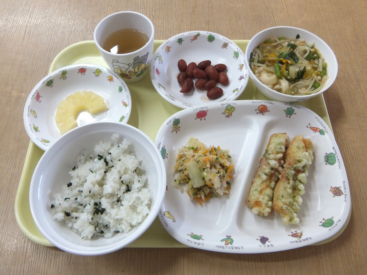 HOME 園の様子 毎日の給食とおやつ 毎日の給食とおやつ 2026/01/29 ☆今日の給食 ・わかめごはん ・ちくわの磯辺揚げ ・金時煮豆 ・ふしめん汁 ・大根とツナのサラダ ・パイン ・麦茶☆3時のおやつ ・スティックパン ・牛乳 今日の給食 3時のおやつ BACK HOME
