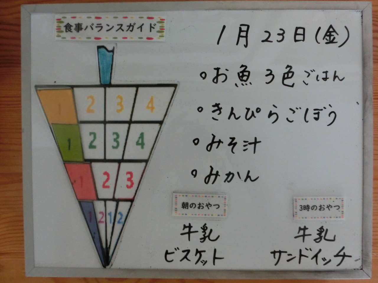 HOME 園の様子 1月23日の給食と食事バランスガイド 1月23日の給食と食事バランスガイド 2026/01/23 保育園での摂取量 今日の副菜はきんぴらごぼうです。ごぼうは食物繊維が豊富で腸の運動を活発にして便秘を予防してくれます。のどに詰まらないように短くカットし、やわらかく炊いて提供しました。 朝のおやつ 今日の給食 今日の給食(アレルギー対応食) 離乳食(中期食) 3時のおやつ(幼児食・アレルギー対応食) BACK HOME