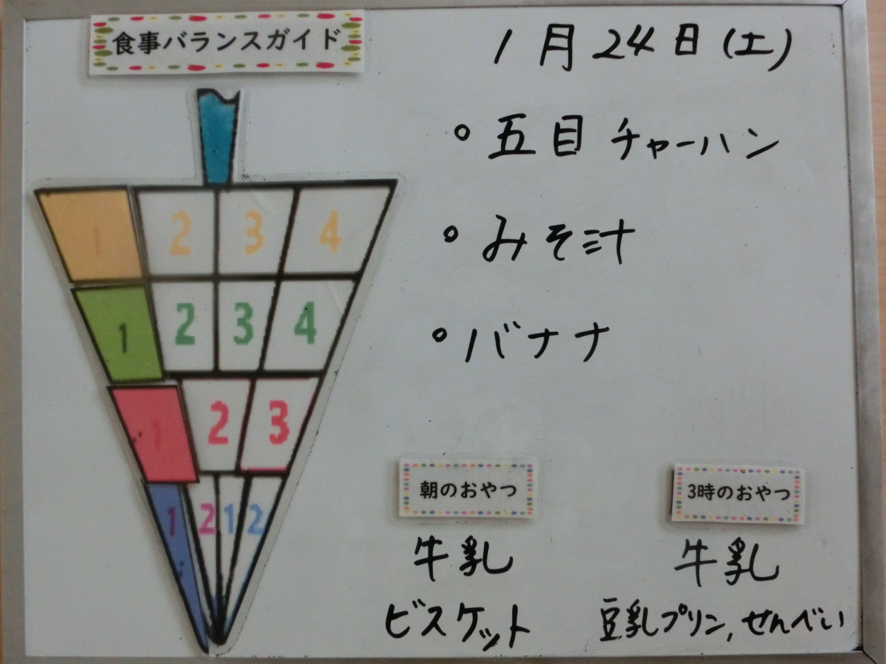 HOME 園の様子 1月24日の給食と食事バランスガイド 1月24日の給食と食事バランスガイド 2026/01/24 保育園での摂取量 今日のメニューは五目チャーハンです。土曜日のお昼はご家庭でも簡単で野菜も食べられるものがいいですね。冷蔵庫あるお野菜を使用して卵をスクランブルエッグにしてチャーハンの上にのせて仕上げるのもいいですね。 朝のおやつ 今日の給食 3時のおやつ BACK HOME