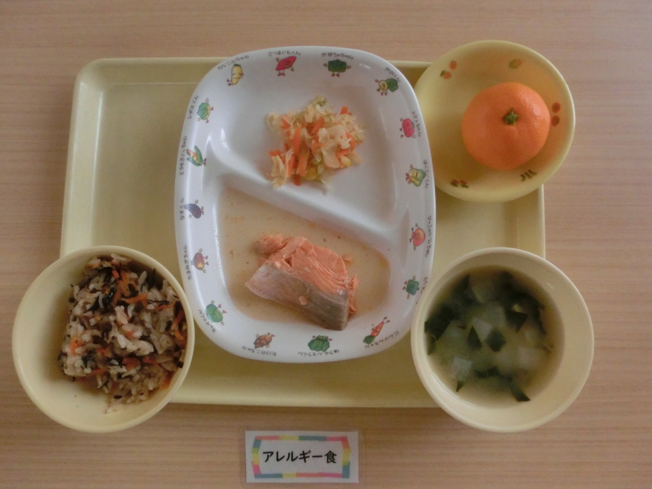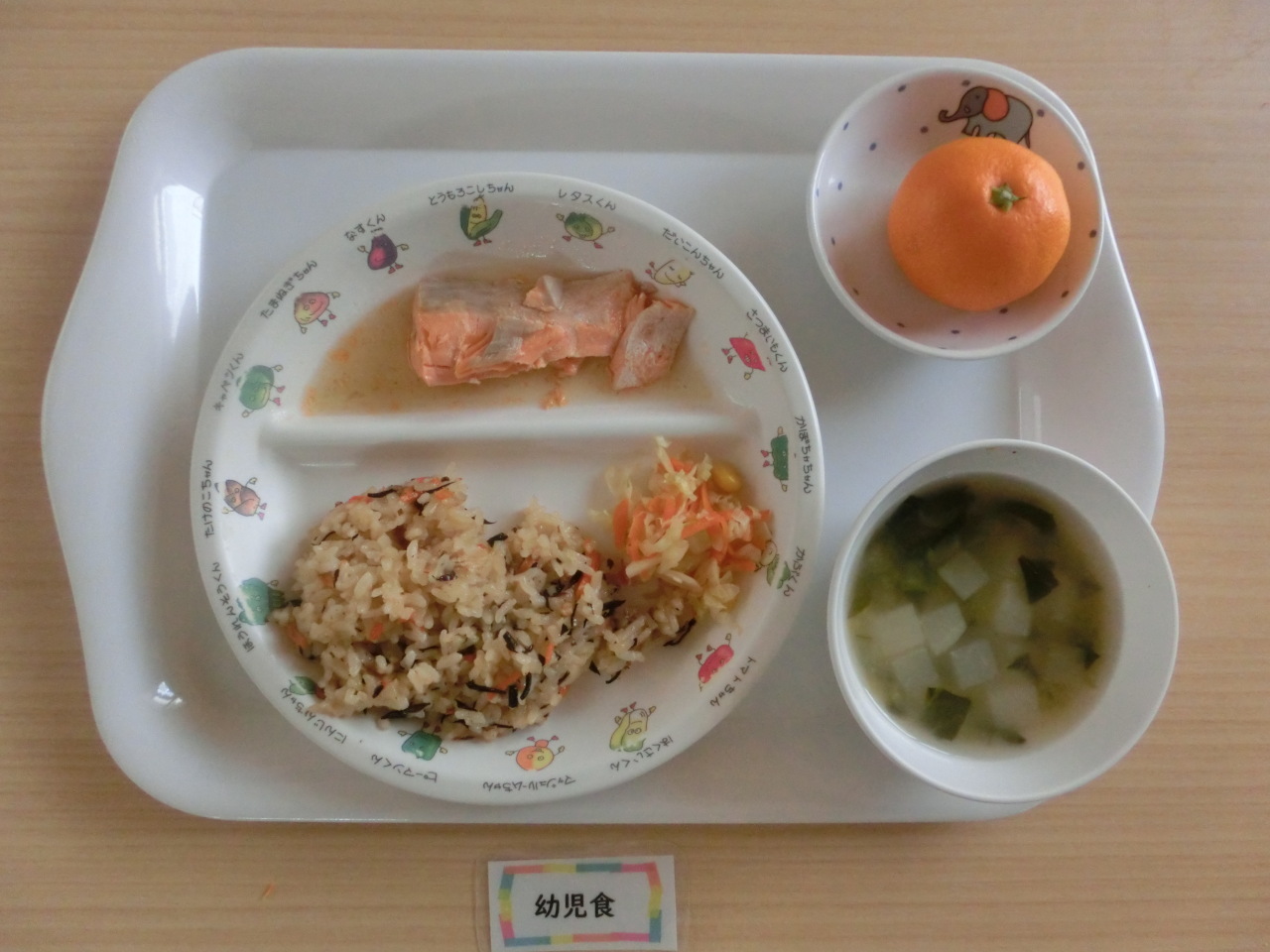 今日の副菜はキャベツの和え物です。冬のキャベツは加熱調理がおすすめです。園では和え物など、キャベツを使用する献立はすべて加熱して使用します。単色野菜の中ではビタミンCが多く含まれています。この季節のキャベツは甘みもあり離乳食の材料としても最適です。