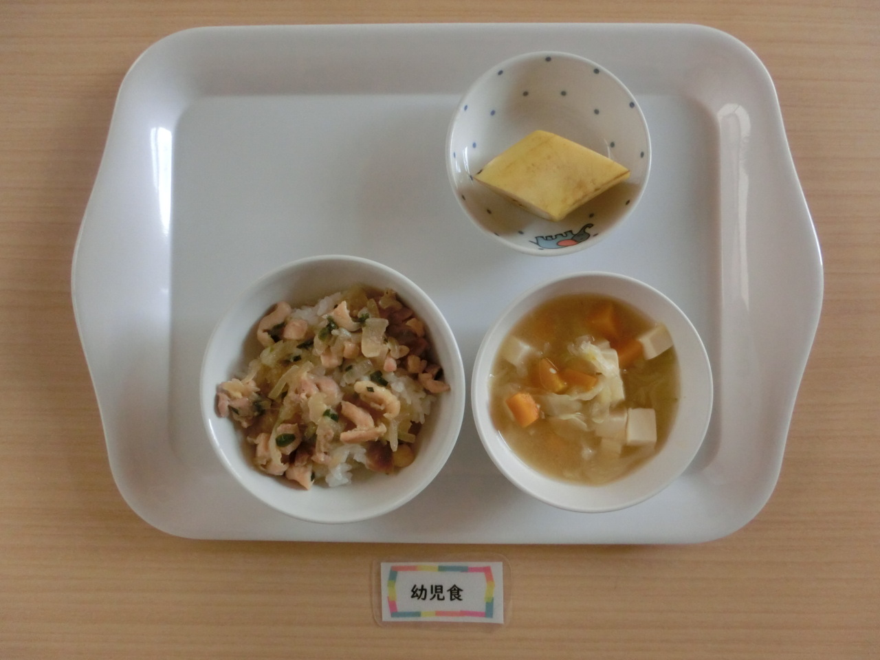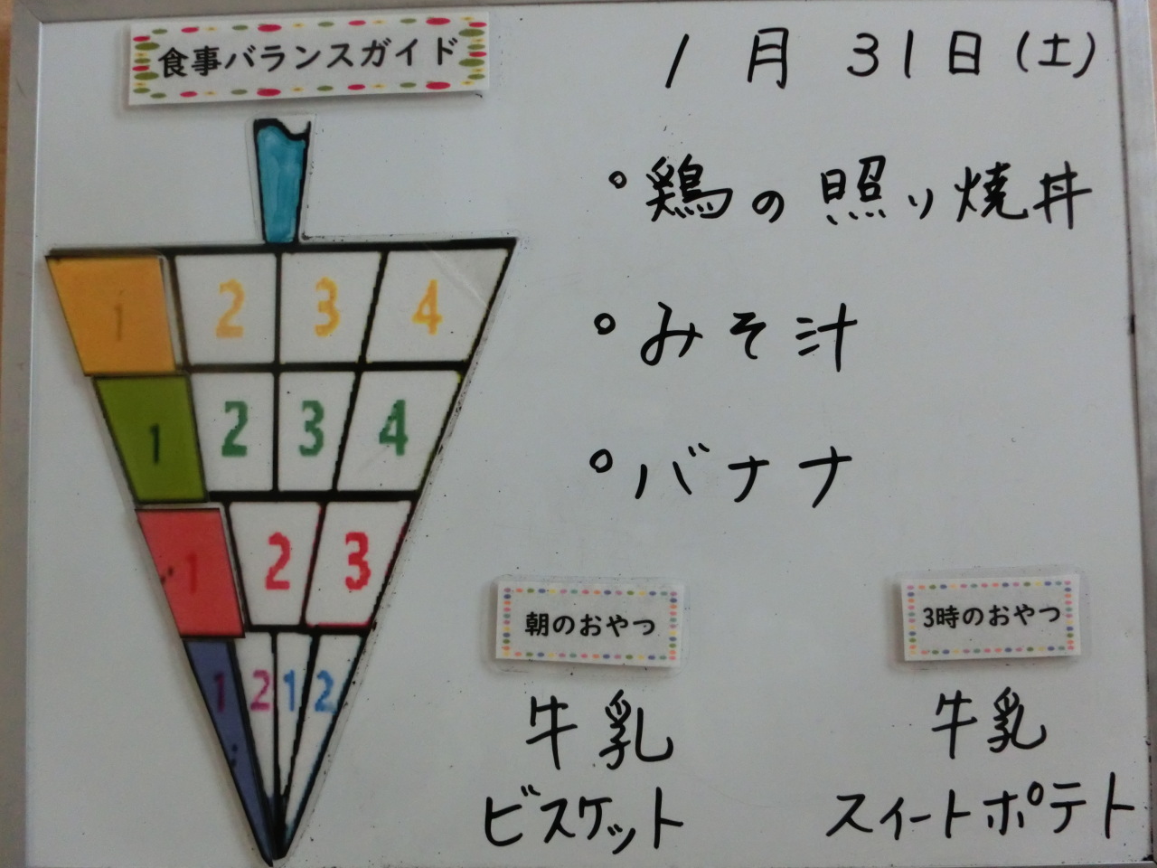 HOME 園の様子 1月31日の給食と食事バランスガイド 1月31日の給食と食事バランスガイド 2026/01/31 保育園での摂取量 今日は鶏肉の照り焼き丼です。園では鶏もも肉をよく使用しますが、鶏肉にはたんぱく質、脂肪、鉄分が豊富で子どもの成長には欠かせません。子どもが食べやすいように一口大に切って鶏肉を甘がらく煮つめます。 朝のおやつ 今日の給食 3時のおやつ BACK HOME