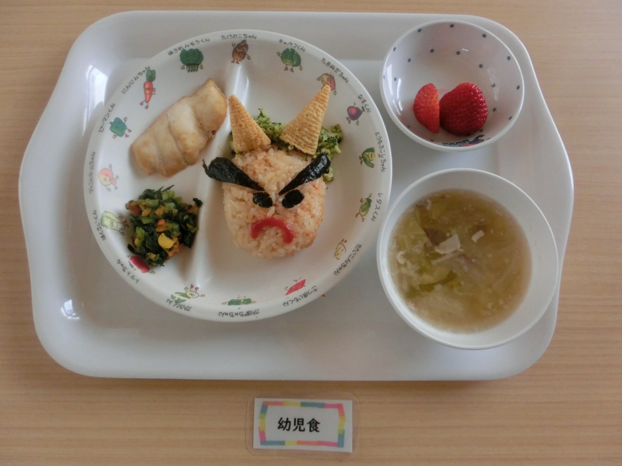 今日は節分です。園にも赤鬼さんと青鬼さんがきたので、子どもたちは豆まきの代わりにボールを投げて鬼を退治しました。給食も鬼ランチです。見た目にも季節を感じる給食をこれからも提供していきます。果物はビタミンCたっぷりのいちごです。甘くて美味しい、いちごだったので、子どもたちも喜んで食べてくれました。
