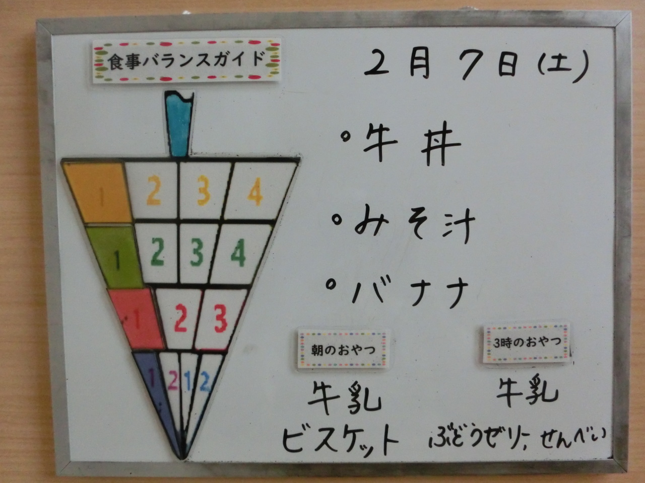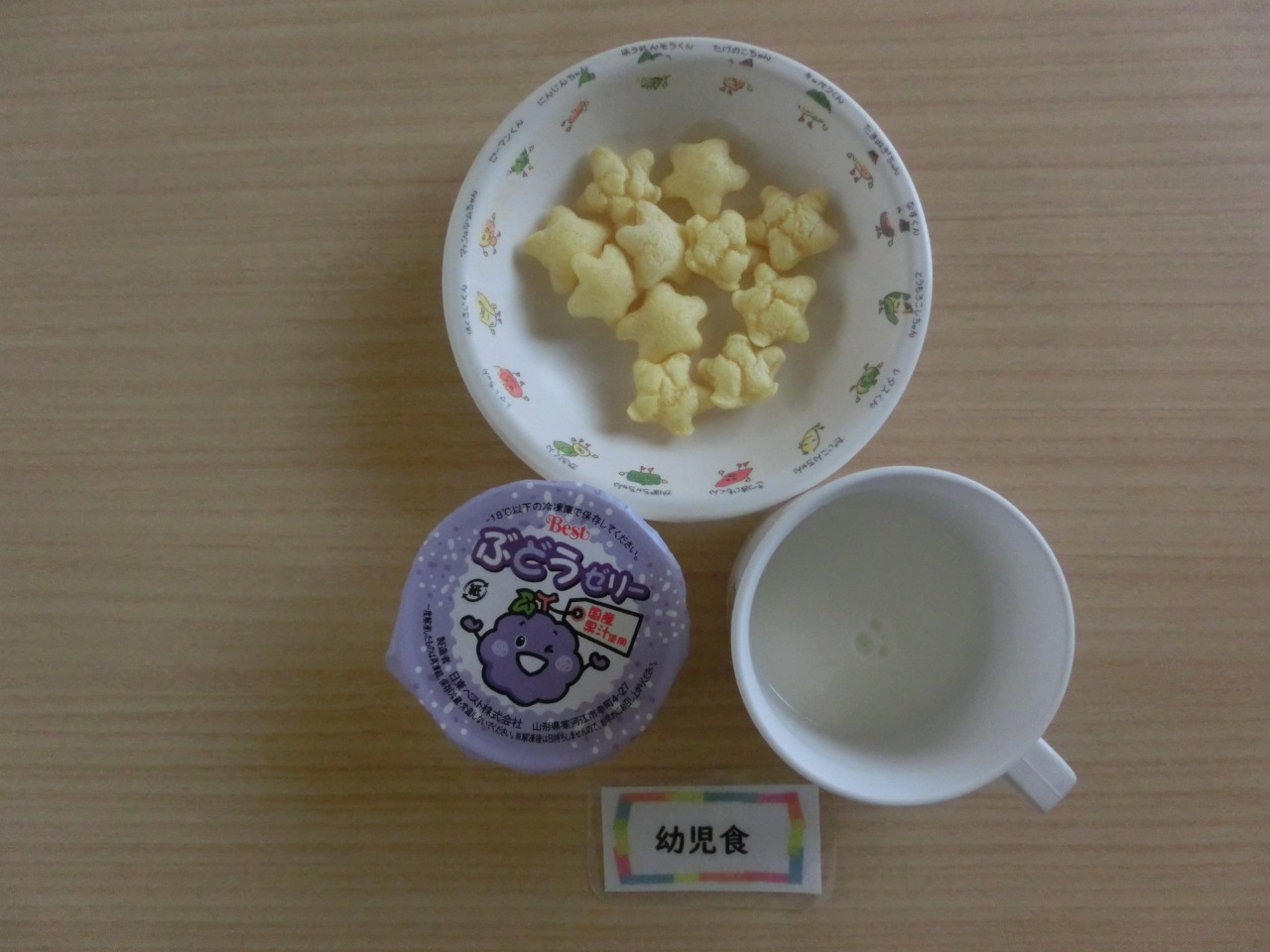 保育園の給食では、食材を小さくカットしています。また、マカロニや麺類なども短くカットし、煮物、和え物の野菜なども柔らかめに茹でています。おやつのパンや果物は担任の先生と相談し、子どもの月齢に合わせ、噛み切る練習もできるようにスティック状や手で持ちやすいようにカットしています。毎日の給食を展示していますので、お迎えの際にぜひご覧ください。