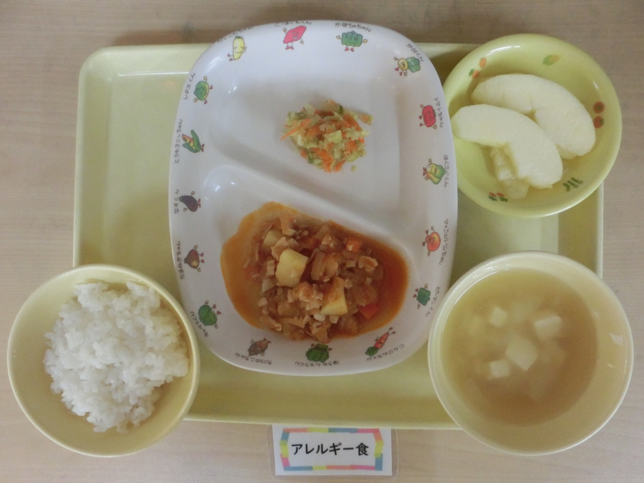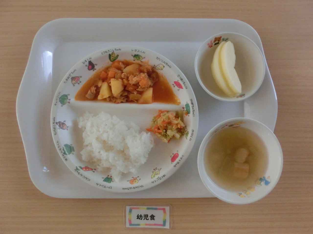 今日はポークビーンズです。植物性タンパク質が豊富な大豆は栄養価が高く、子どもさんに食べて欲しい食材です。苦手な子どもさんもいるかもしれませんが、水煮の大豆を使用すると柔らかく、じゃが芋ともよく合います。トマトホール缶を使用し、ケチャップで甘めに味付けするので子どもさんも食べやすい味付けです。