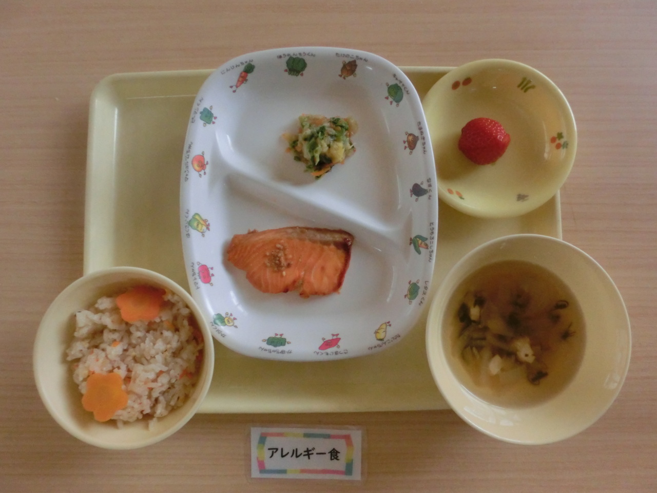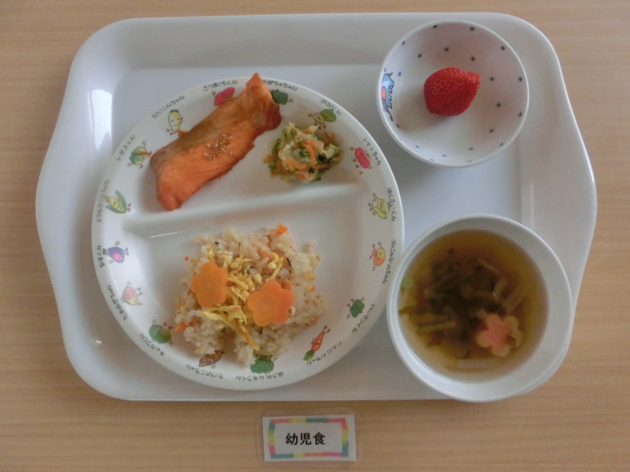 炊き込みご飯は、錦糸卵を散らし花形人参を盛りつけ、見た目にも春を感じる給食にしました。