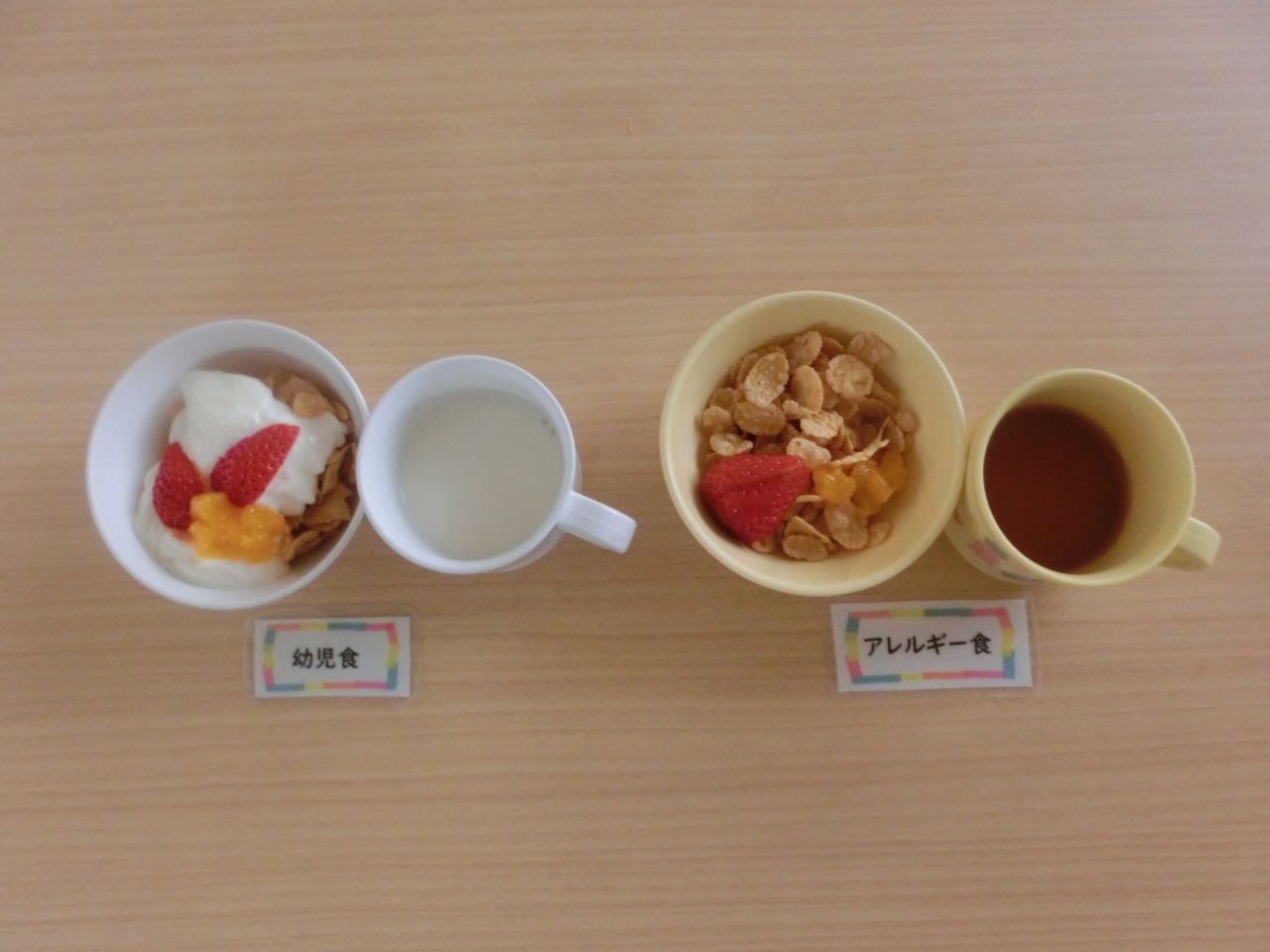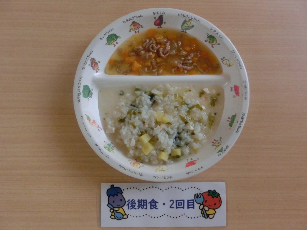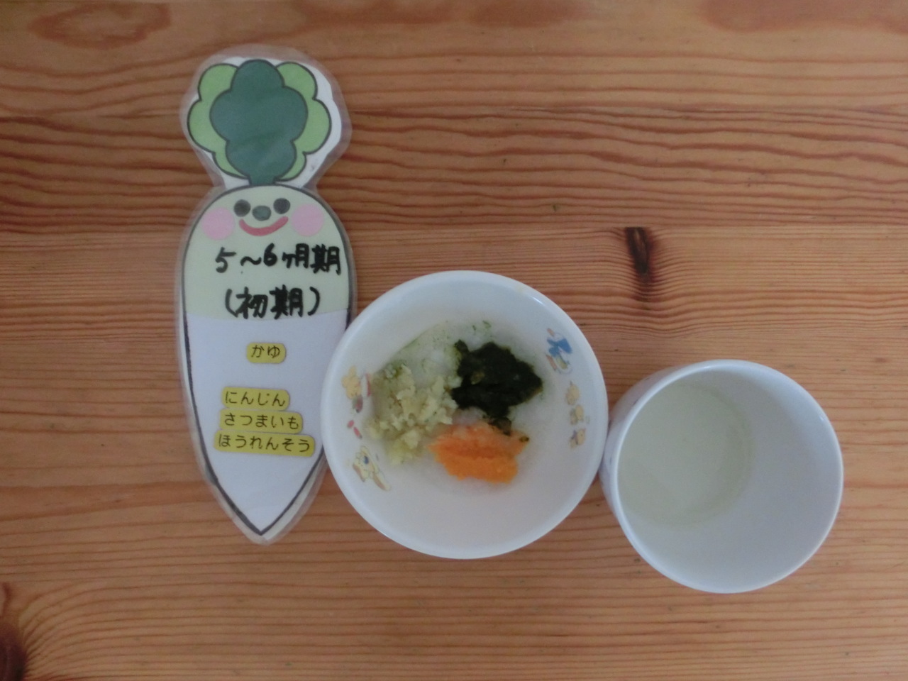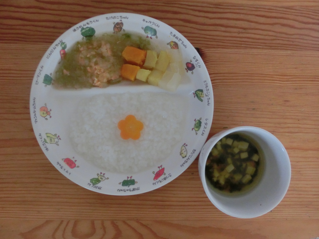 副菜には菜の花を使用しています。菜の花は少し苦みがあり、苦手なお子さんもいると思いますが、ビタミンCやカルシウムが多く含まれます。白菜、人参を一緒に入れて和え物にすることで、苦みもあまり感じず食べやすく仕上げました。どのクラスもほとんど残量はありませんでした。