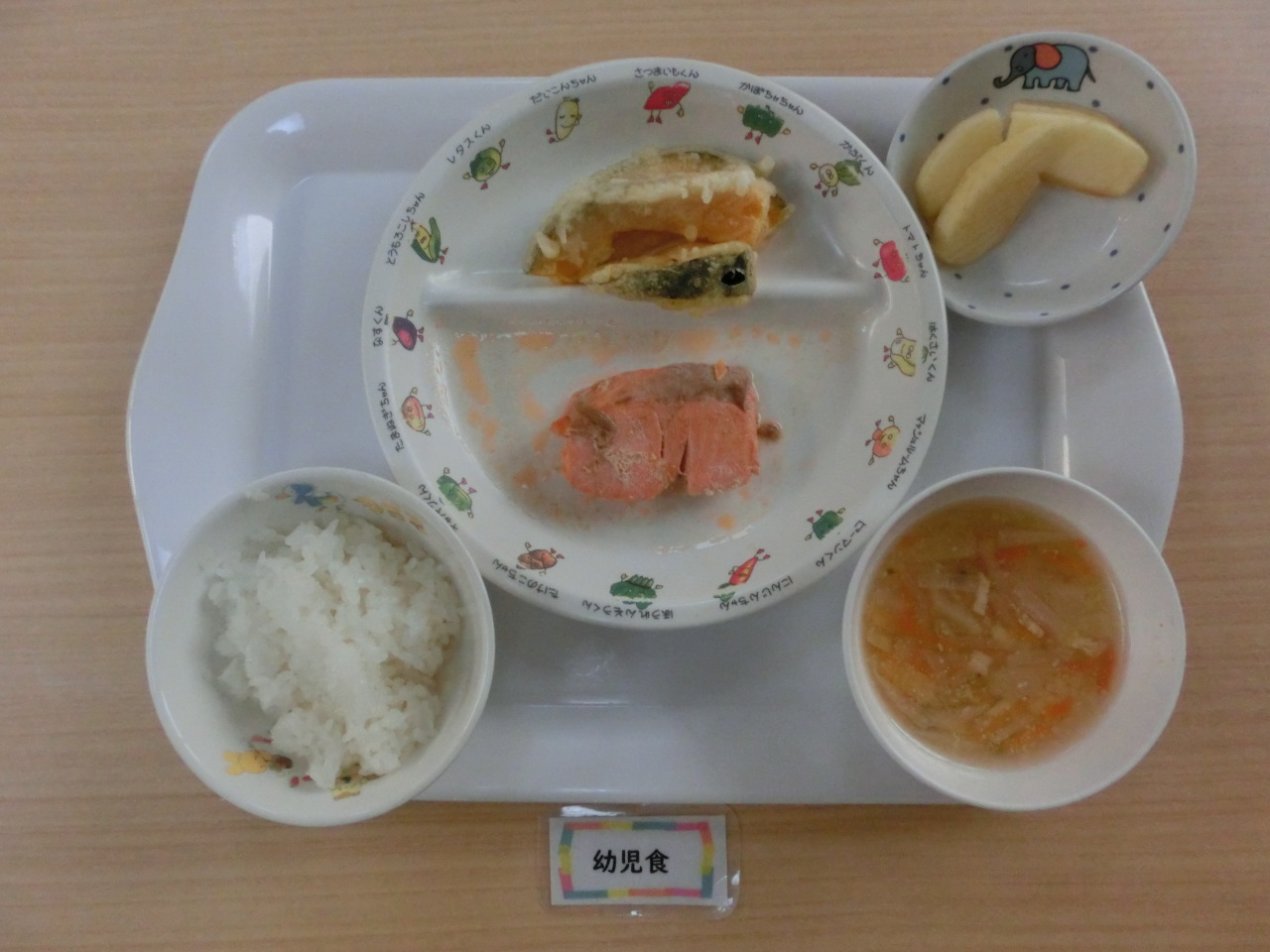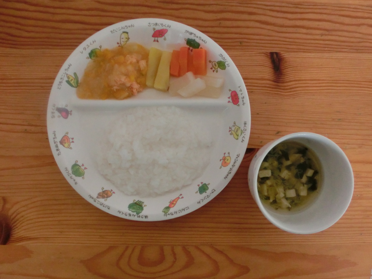 味噌汁に豆乳を入れることで、まろやかな味になり子どもたちや先生にも人気です。たくさん野菜の入った豆乳味噌汁、美味しいですよ。