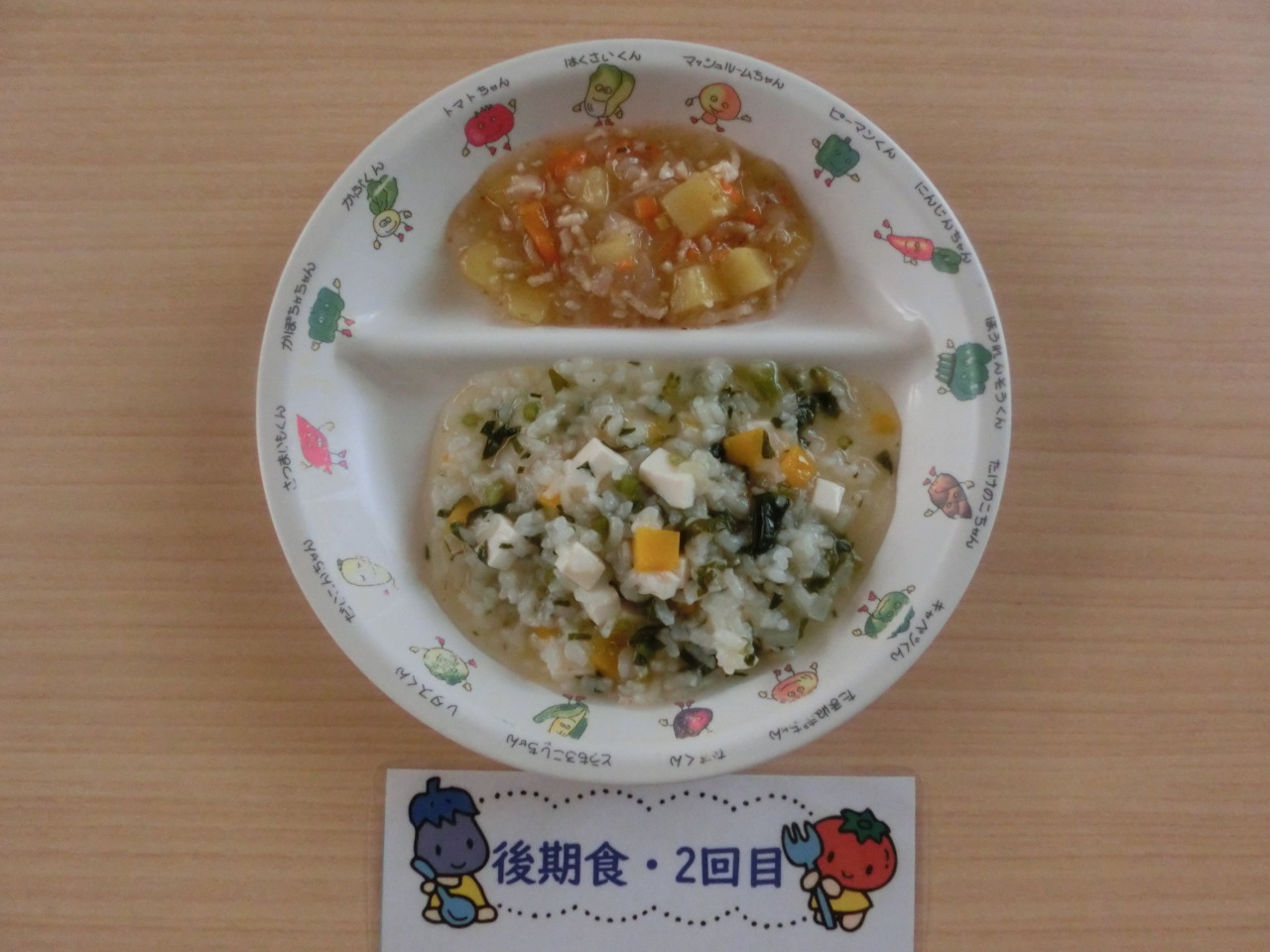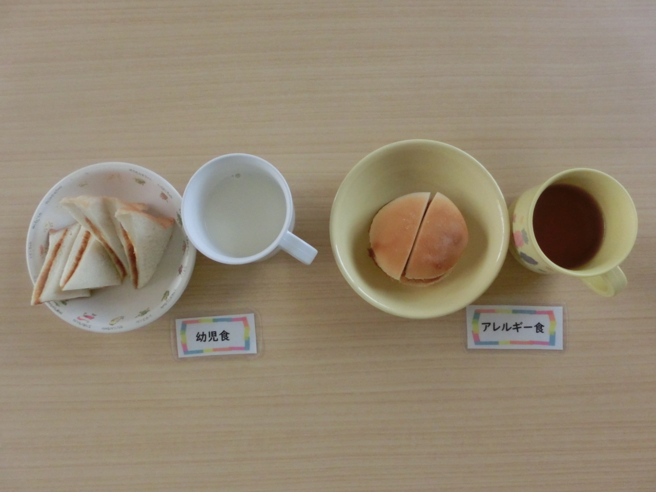 今日のお汁は豆乳味噌汁です。園では月1回程度、豆乳味噌汁を提供しています。豆乳は大豆を水に浸してすりつぶし、煮詰めた汁をこしてから作られています。たんぱく質が豊富に含まれており、子どもたちの成長には欠かせない栄養素です。