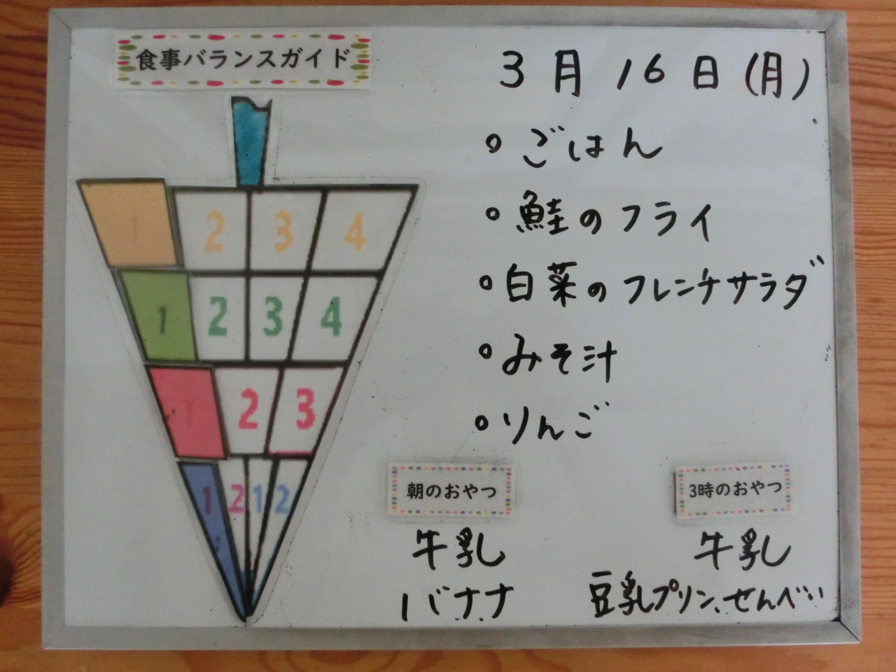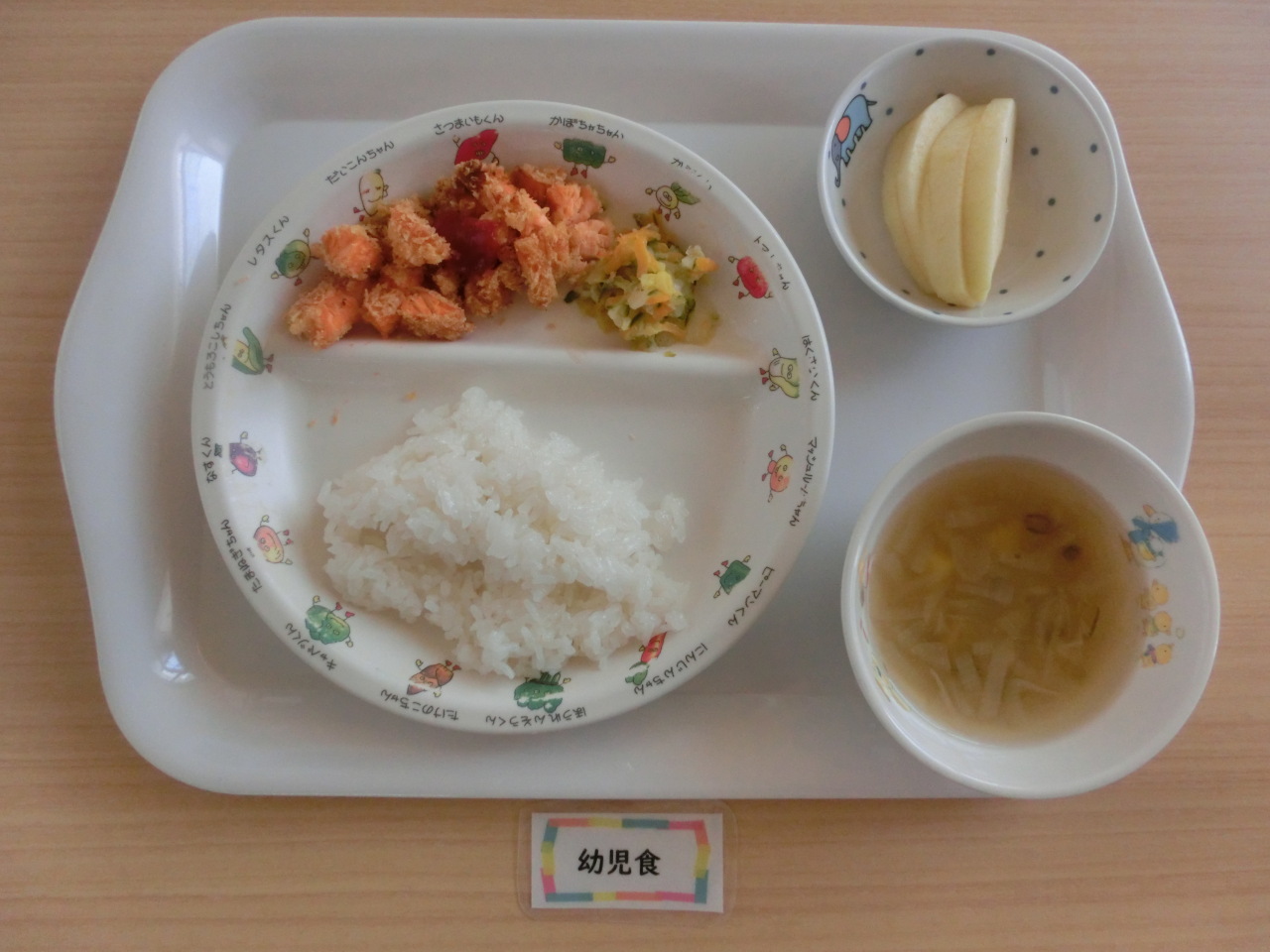 今のクラスのお友達や先生と一緒に遊んだり給食を食べるのもあと少しですね。今日は鮭のフライです。調理室からは揚げ物のいい香りがして食欲をそそります。「いいにおいがするねー」と先生と子どもが調理室を見に来てくれることもあります。お腹を空かせて給食をたくさん食べてくれることが調理室の私たちにとって一番の喜びです。今日もどのクラスもたくさん食べてくれました