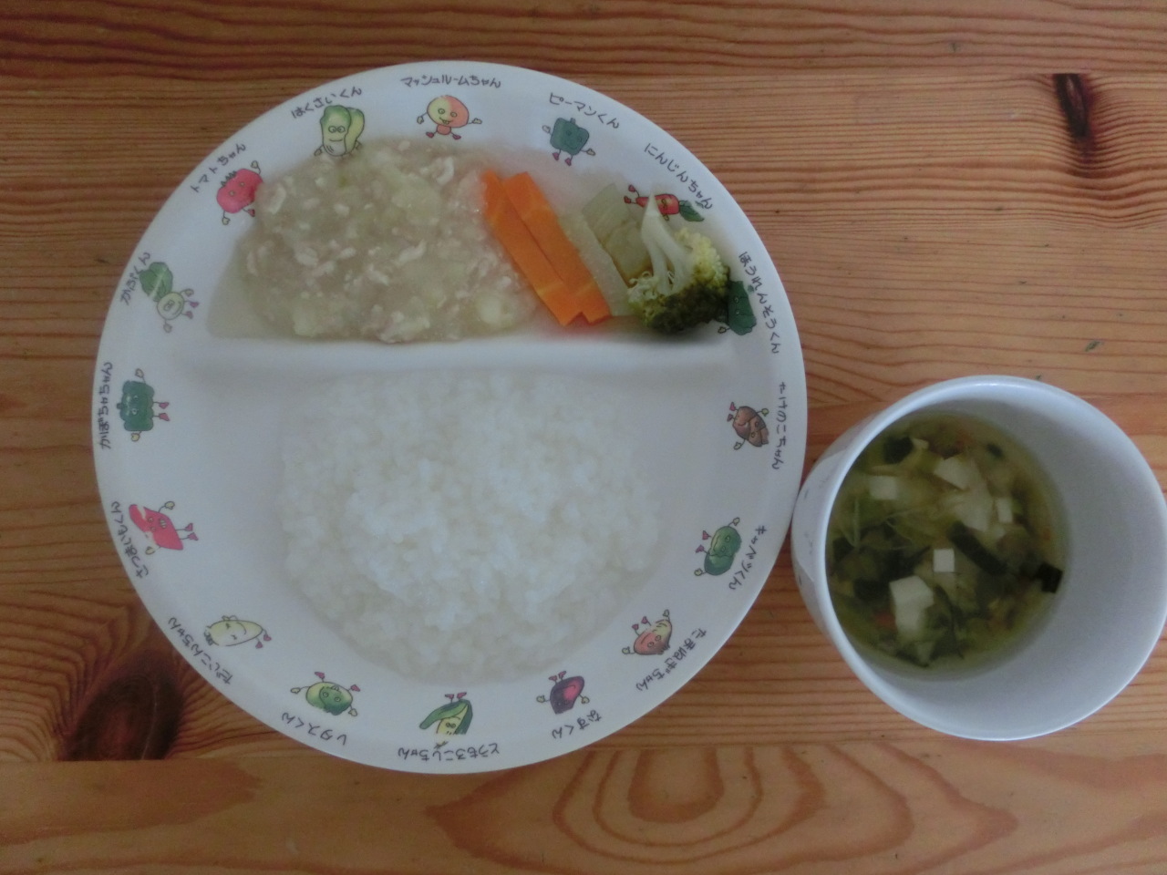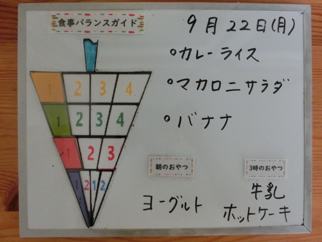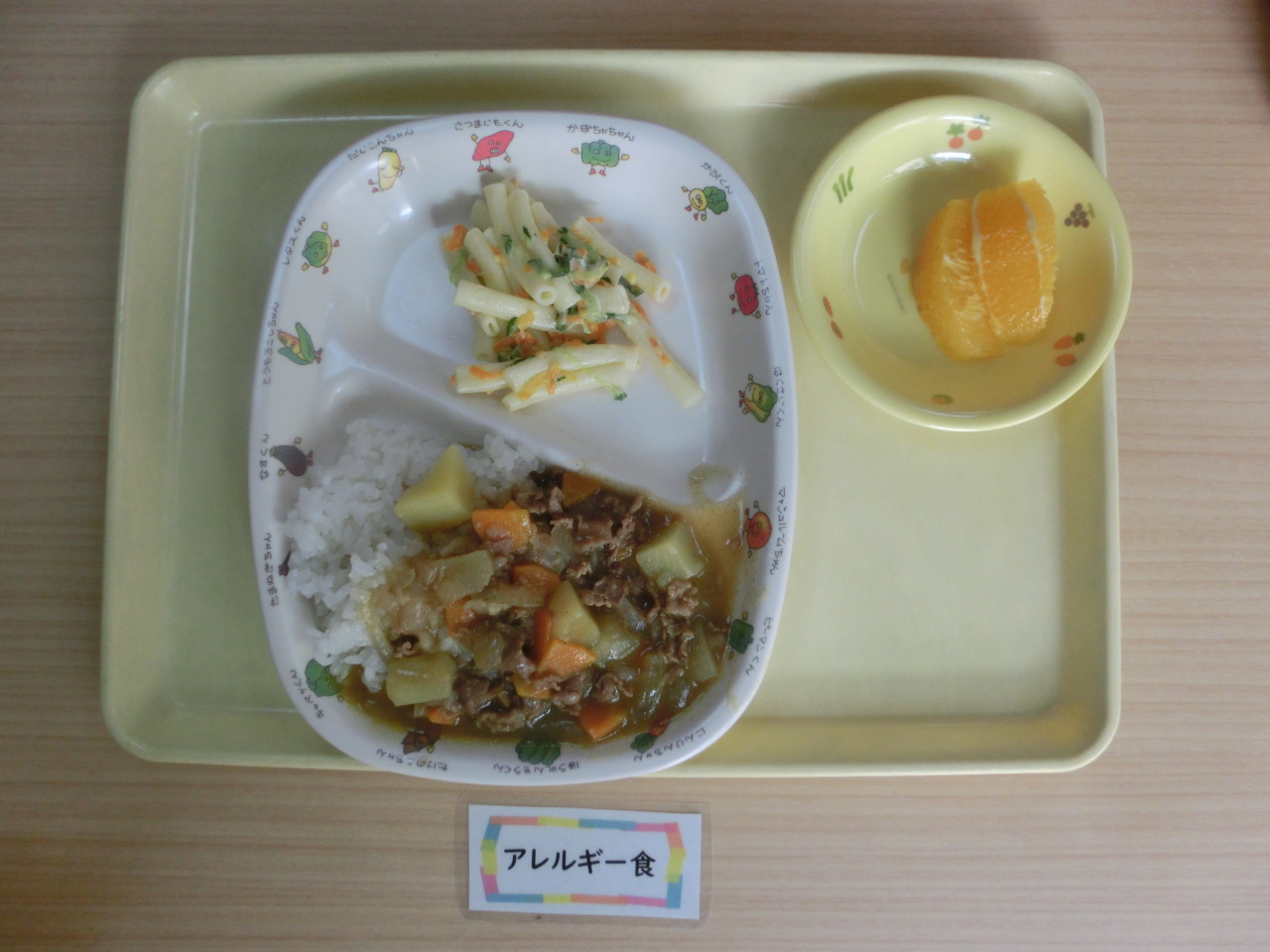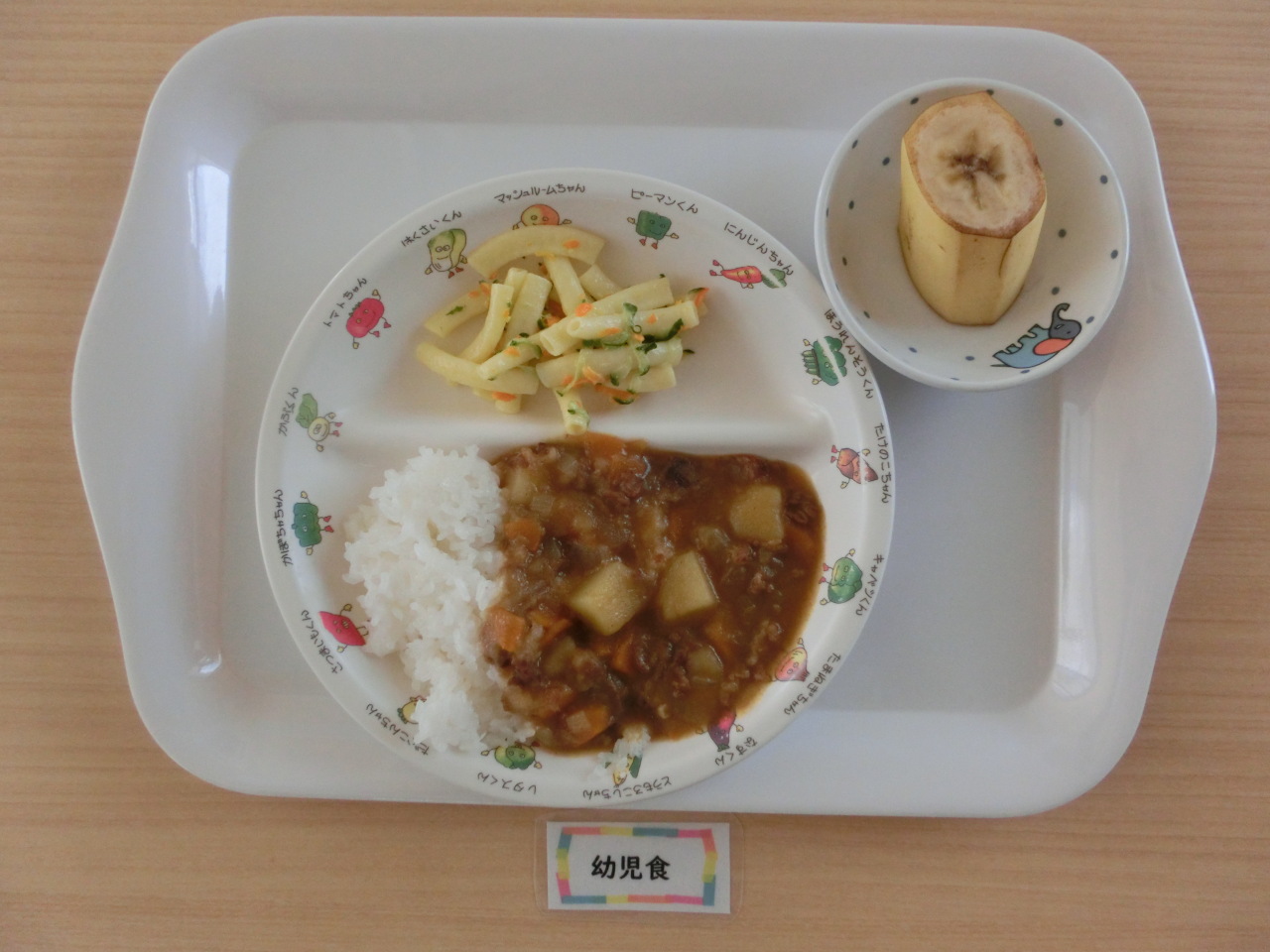 朝、夕少し過ごしやすい気温になりましたね。うさぎ組。きりん組の子どもたちは園庭で元気に遊びました。大きなバッタを見つけて、おおはしゃぎでした。さて、今日の献立はカレーライスです。園では具材も食べやすい大きさにカットしています。子どもも先生もよく食べてくれました。