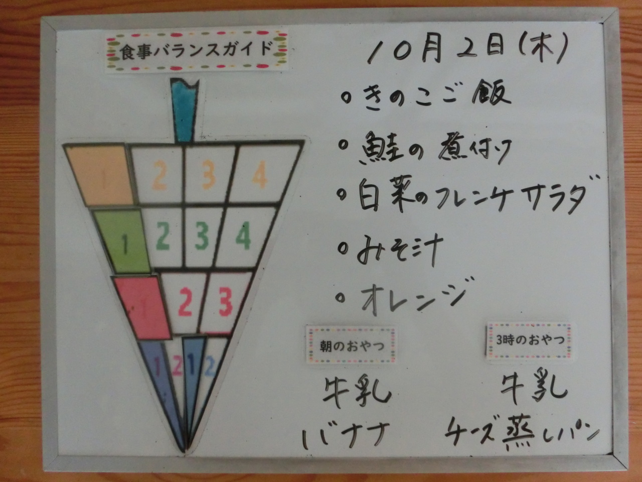HOME 園の様子 10月2日の給食と食事バランスガイド 10月2日の給食と食事バランスガイド 2025/10/02 保育園での摂取量 今日はきのこごはんです。きのこにはビタミン、ミネラル、食物繊維が多く含まれていて秋が旬の野菜です。「香りマツタケ味シメジ」といわれるようにうまみ成分をたっぷり含みます。 朝のおやつ(幼児食・アレルギー対応食) 今日の給食 今日の給食(アレルギー対応食) 離乳食(後期食) 3時のおやつ(幼児食・アレルギー対応食) 離乳食(後期食)2回目 BACK HOME