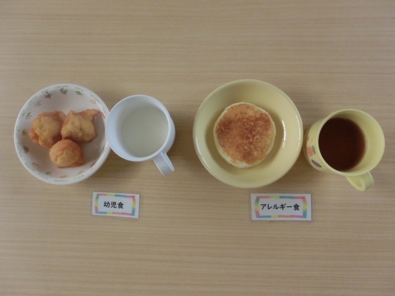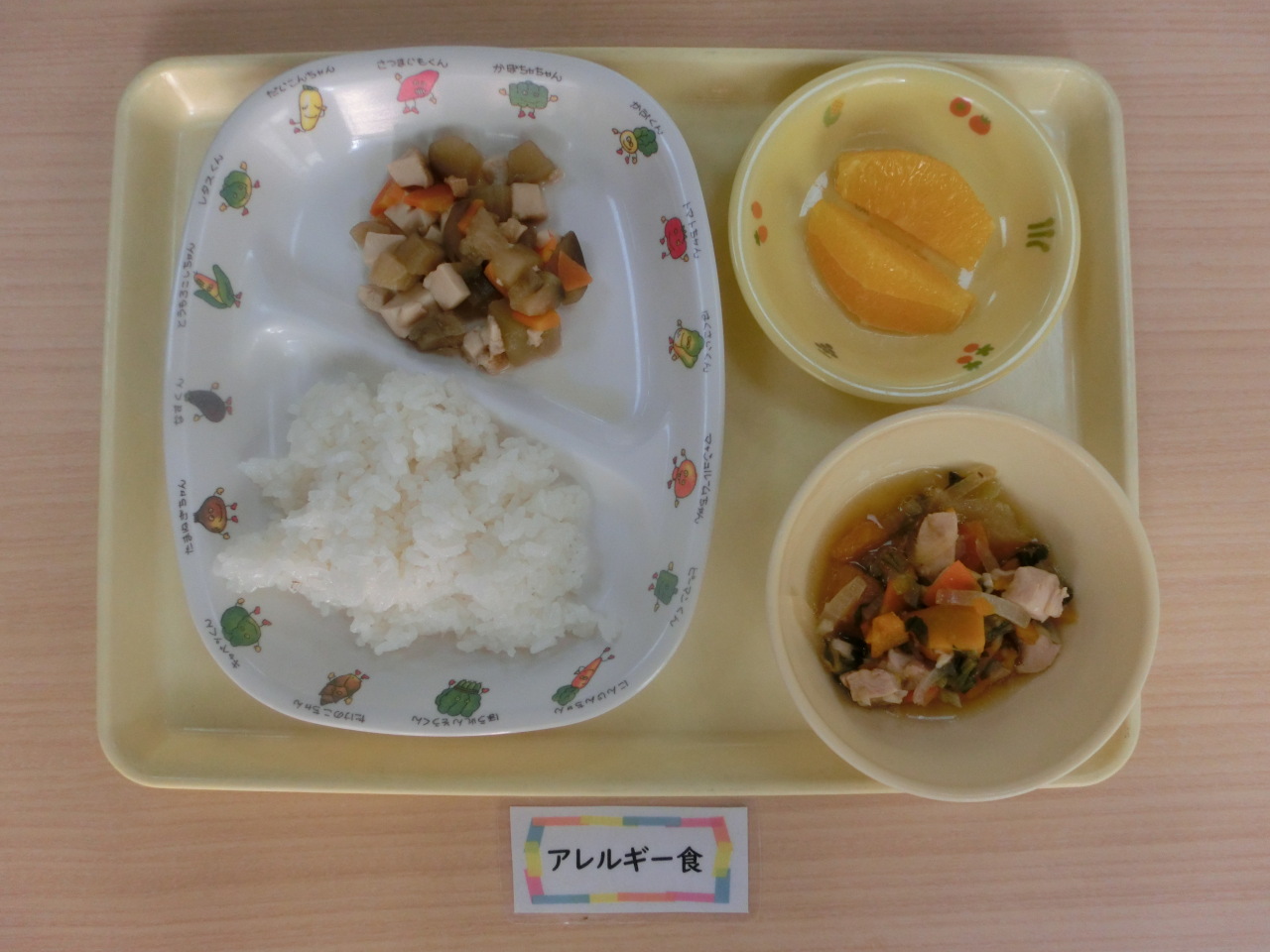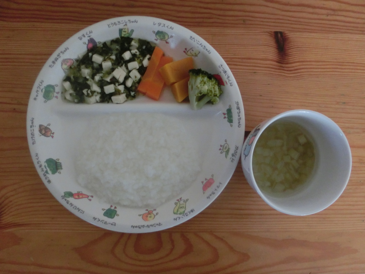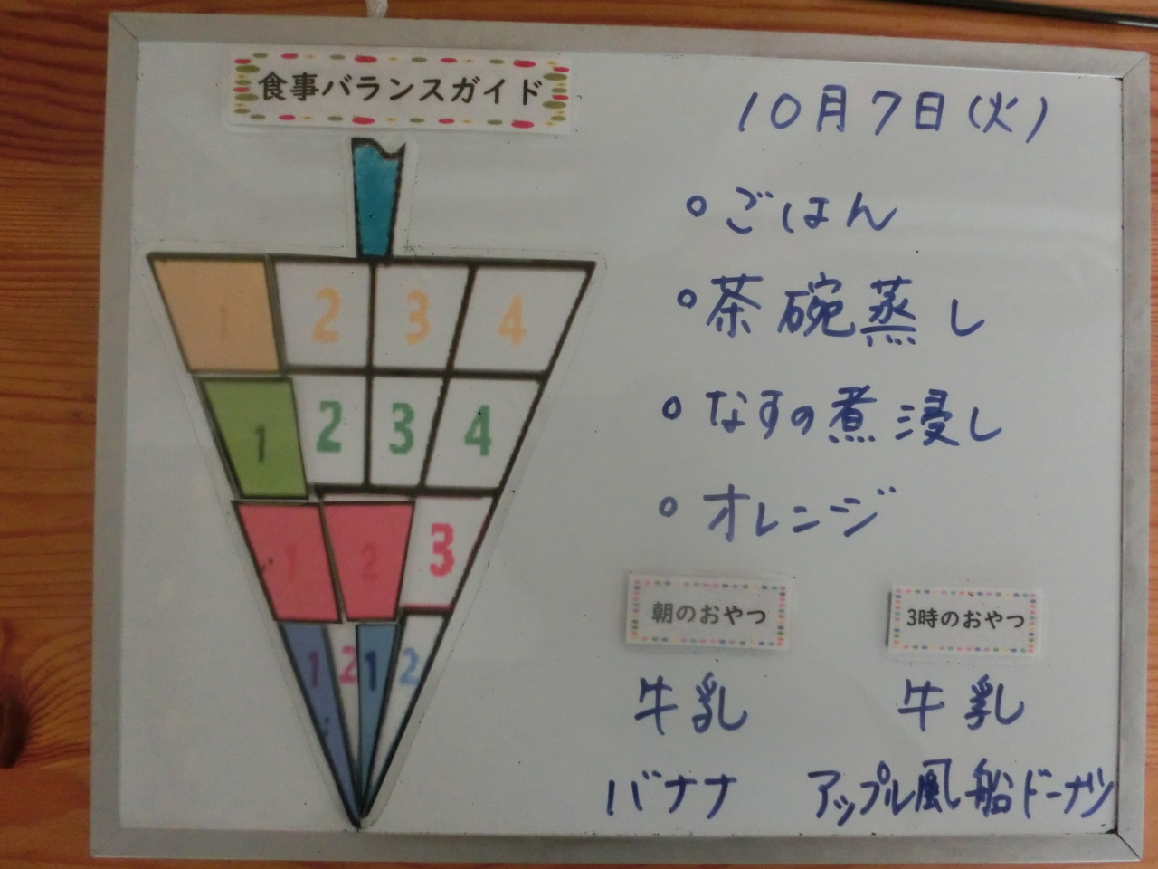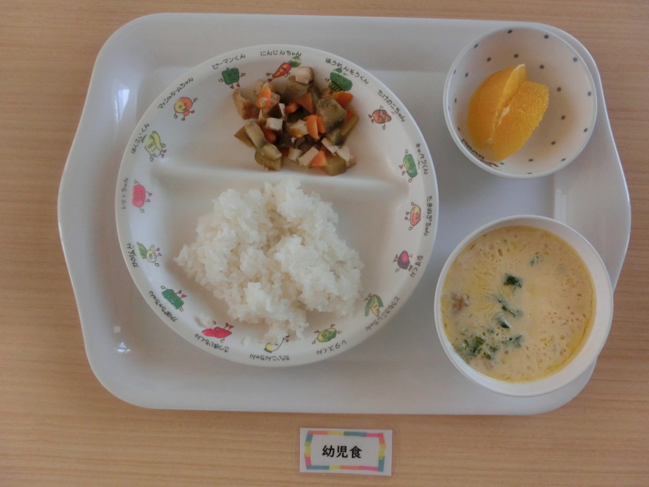 今日のメニューは茶わん蒸しです。卵のタンパク質が熱によって固まる性質を利用した料理です。園では具材に青菜を先にゆがき、鶏肉、人参、生シイタケを砂糖、しょう油、みりん、出汁で炊き味をしみこませます。茶わん蒸しの容器に具材を入れ、卵液を入れて蒸せば出来上がりです。最近は給食の先生に「おいしいよー」と直接感想を伝えてくれることもあります。