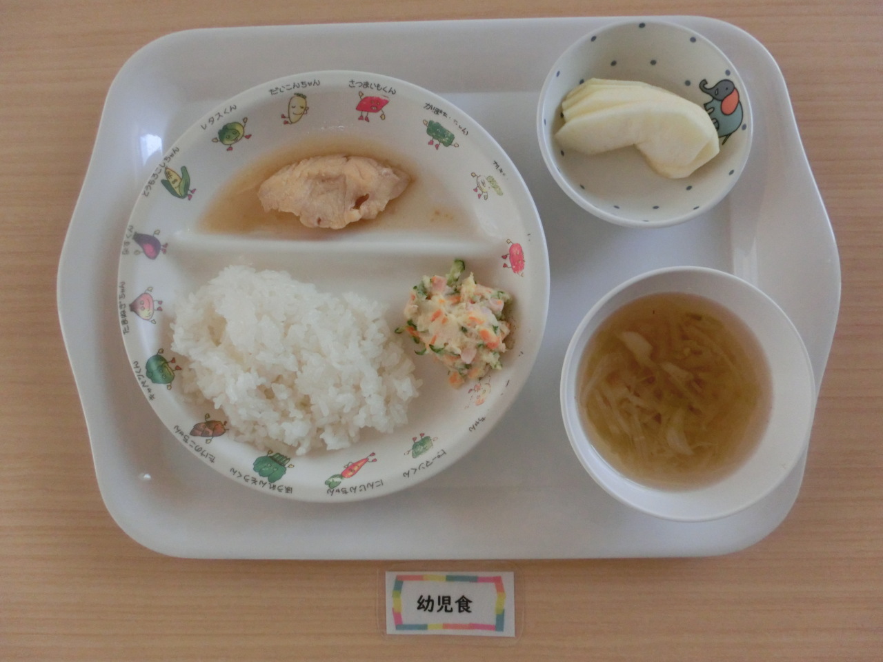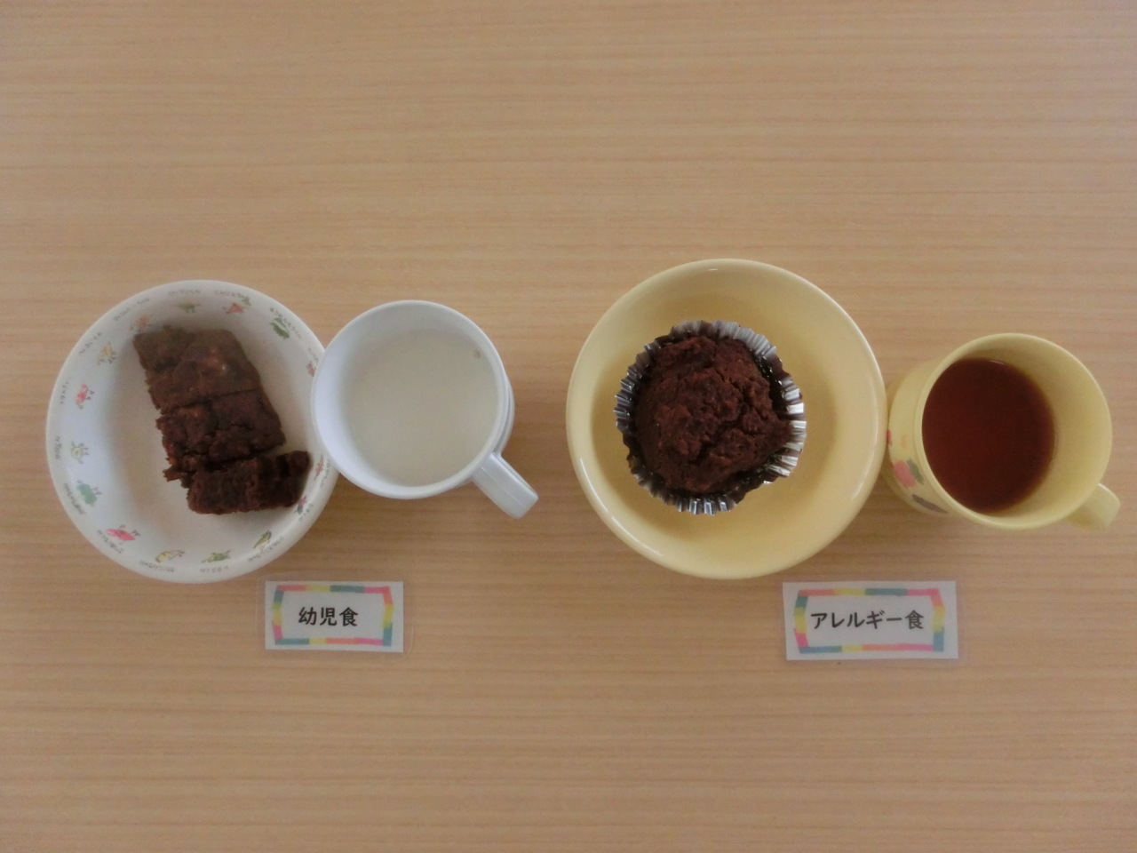 今日のおやつはソイブラウニーです。米粉を使ったおやつなので、もちもちとした仕上がりで、小麦アレルギーのある子どもさんでも食べられるおやつです。木綿豆腐をクリーム状にして生地に混ぜ込んだ栄養たっぷりのおやつです。