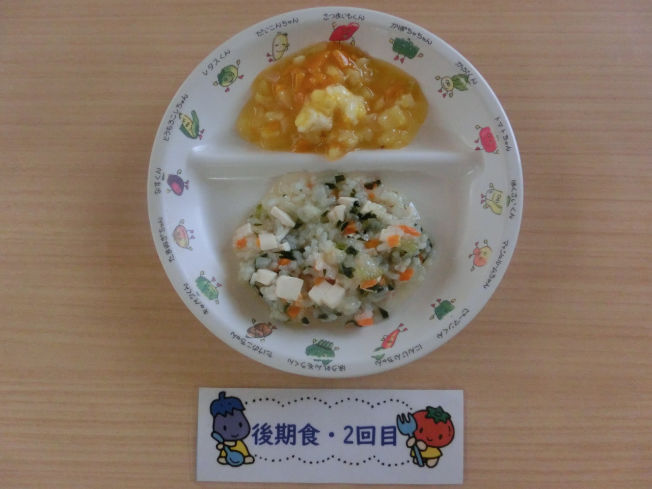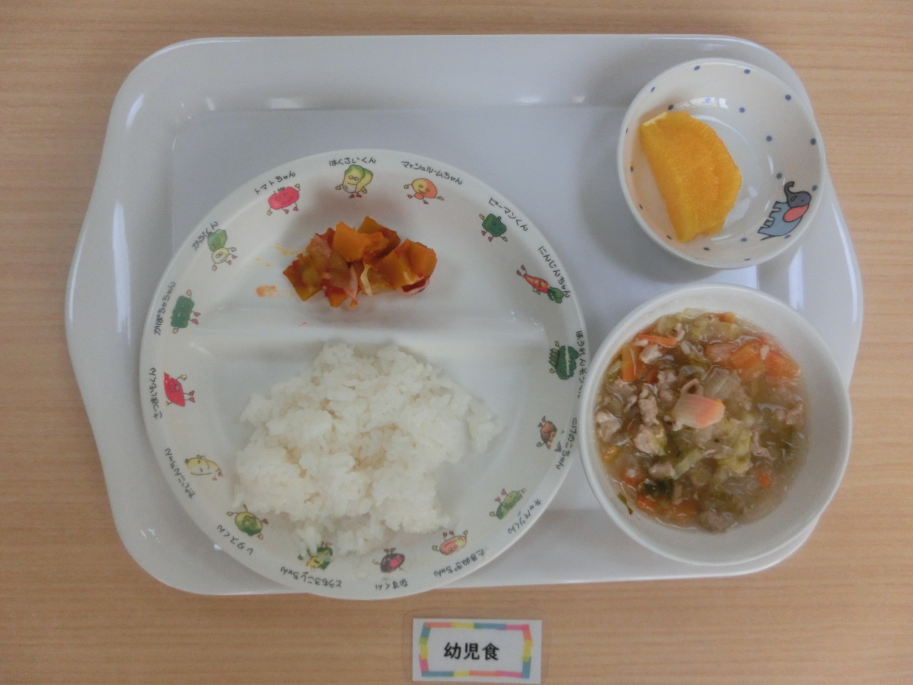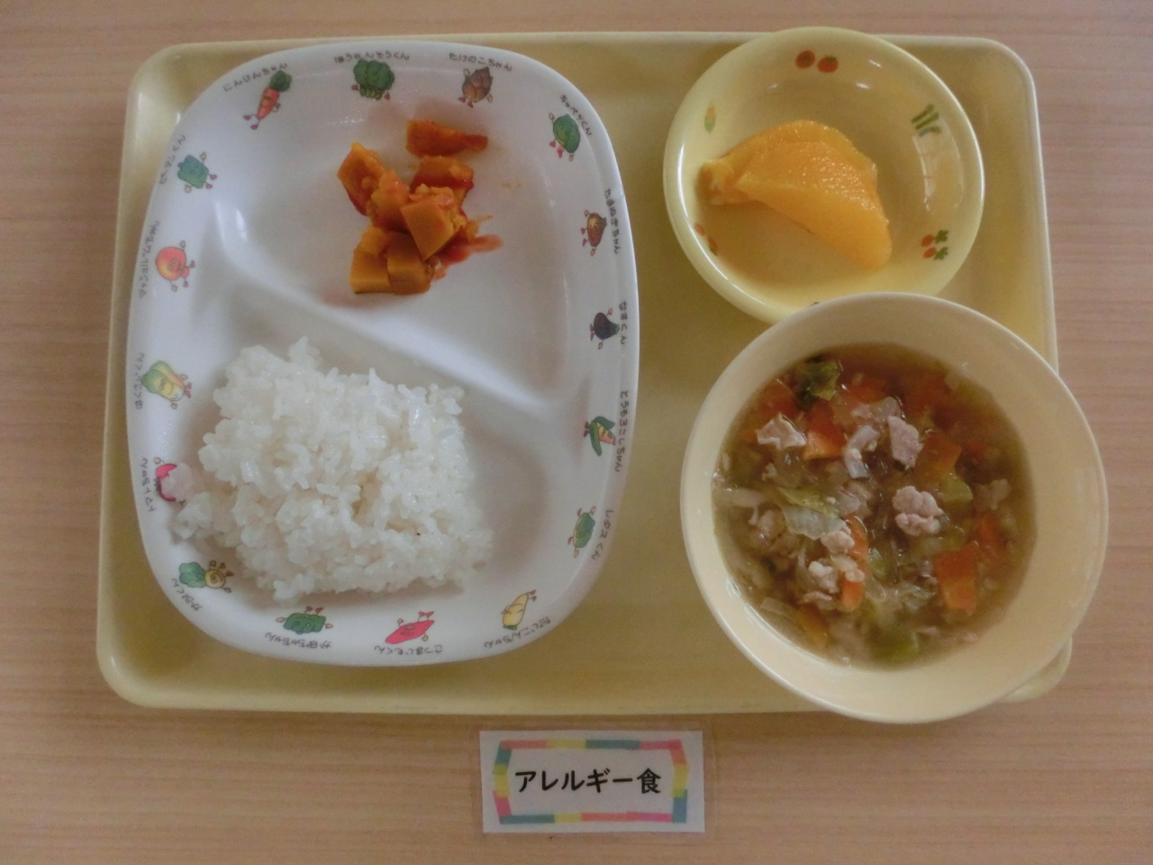 今日は豚肉と白菜のスープ煮です。これから寒くなる季節にピッタリの料理です。白菜、玉ねぎ、人参、生しいたけ、豚肉、春雨とたっぷり具材を使ったスープにしました。野菜の甘みと豚肉のうま味が出たスープに仕上げました。子どもたちは野菜も残さずに食べてくれました。
