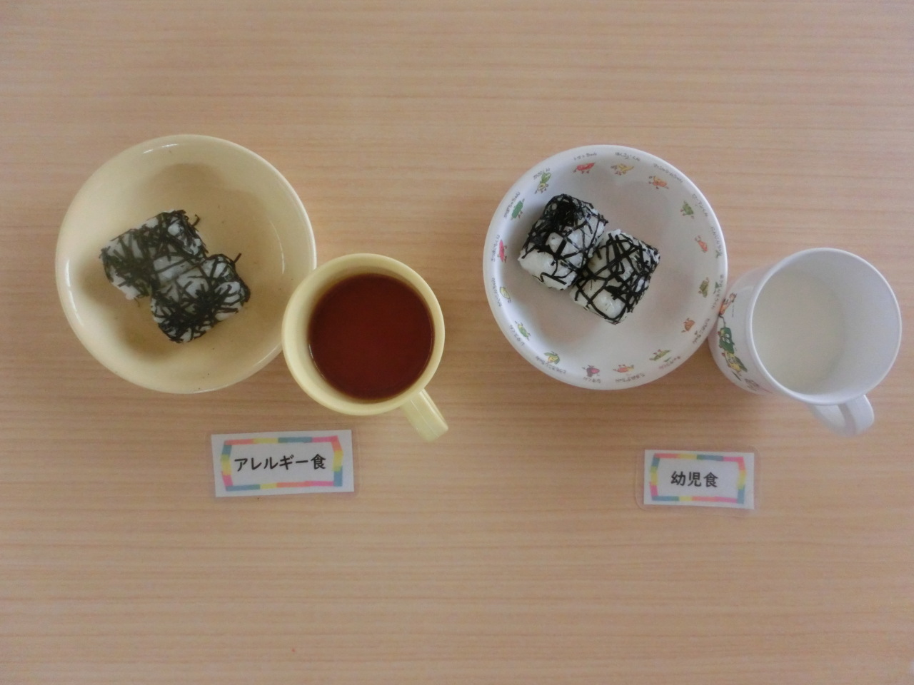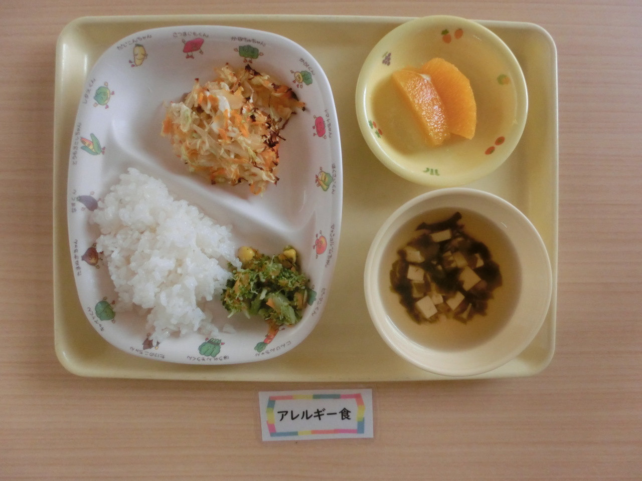 今日のメニューは鮭のちゃんちゃん焼きです。園ではオーブンで蒸し焼きのようにするので、鮭の上にのせたキャベツ、玉ねぎ、人参もやわらかい仕上がります。味噌、みりん、さとうで味付けしたお野菜は食べやすく先生方にも人気です。