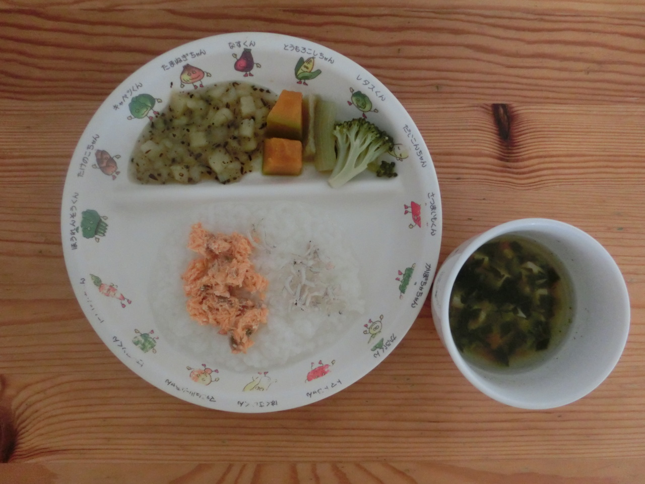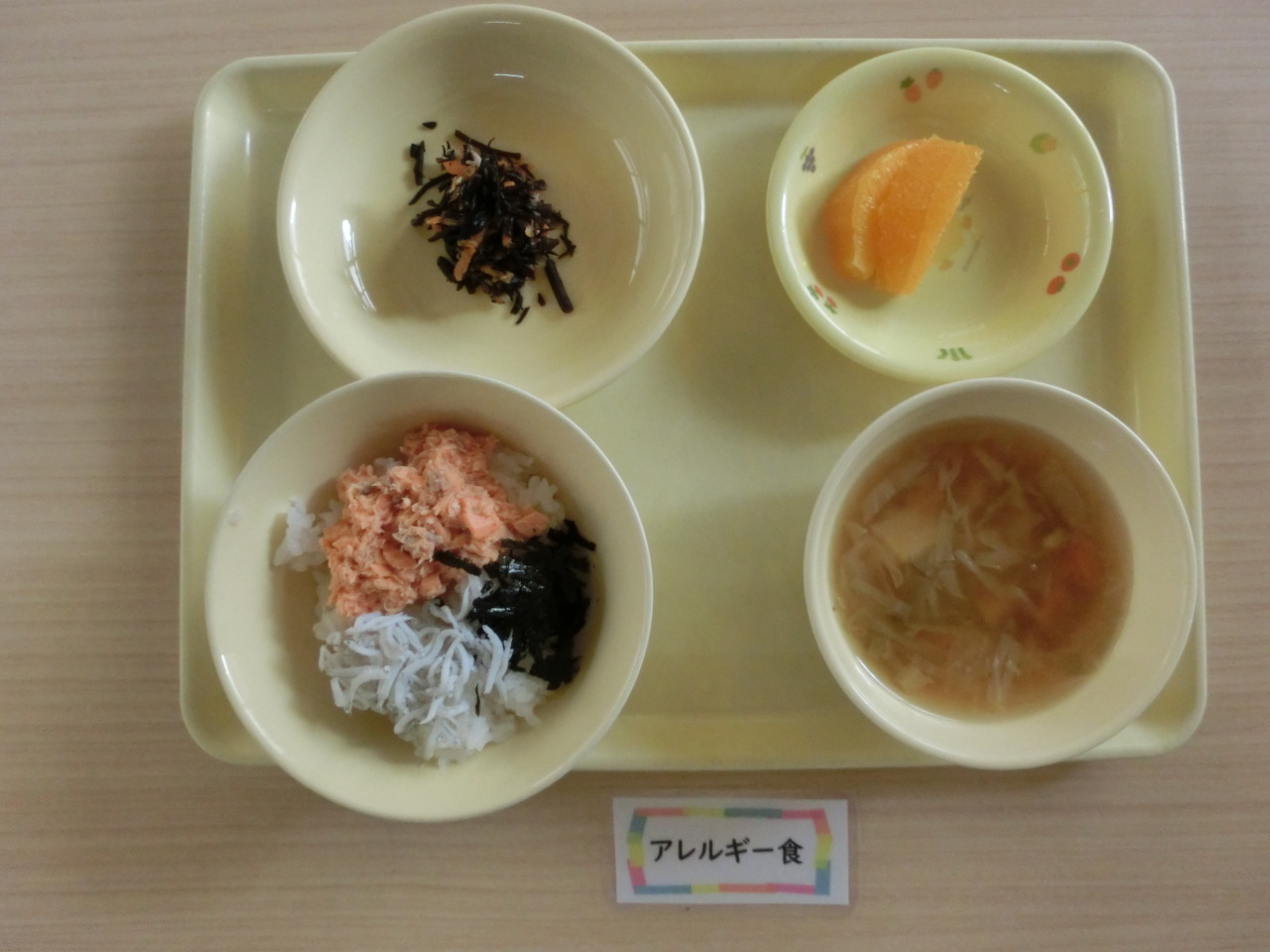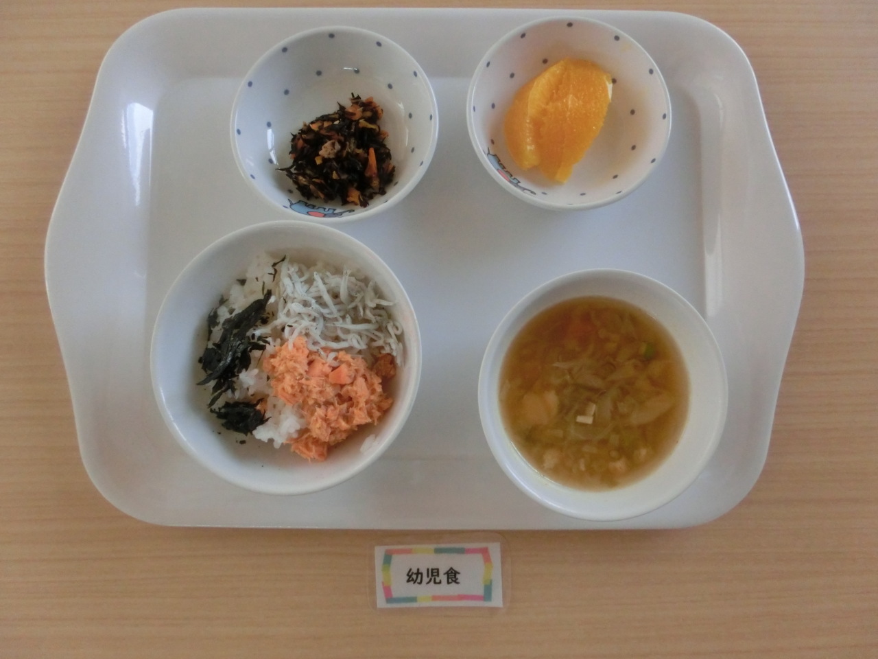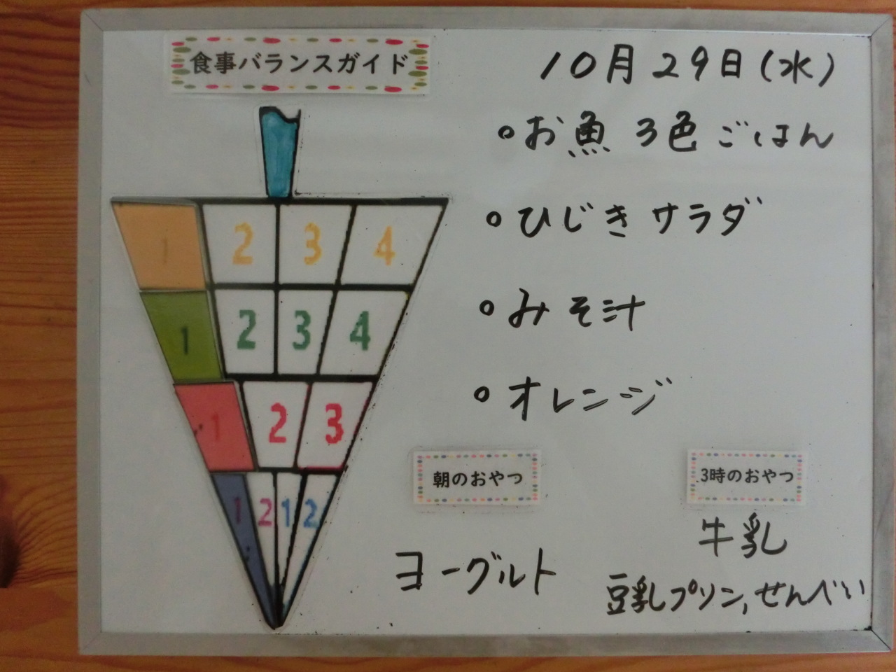 HOME 園の様子 10月29日の給食と食事バランスガイド 10月29日の給食と食事バランスガイド 2025/10/29 保育園での摂取量 子どもたちも先生も大好きなお魚3色ごはんです。甘めに煮付けた鮭をほぐしてご飯の上にのせます。釜揚げしらすはサッと湯がいて塩味を減らします。味付け海苔をのせ、よく混ぜて食べて下さい。どのクラスも完食でした。 朝のおやつ 今日の給食 今日の給食(アレルギー対応食) 離乳食(後期食) 3時のおやつ(幼児食・アレルギー対応食) 離乳食後期(2回目) BACK HOME