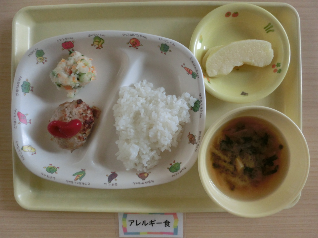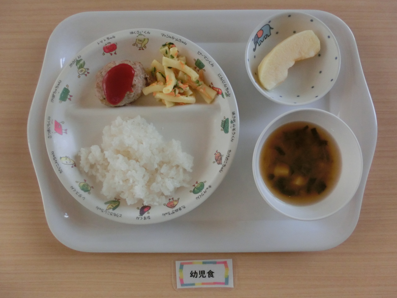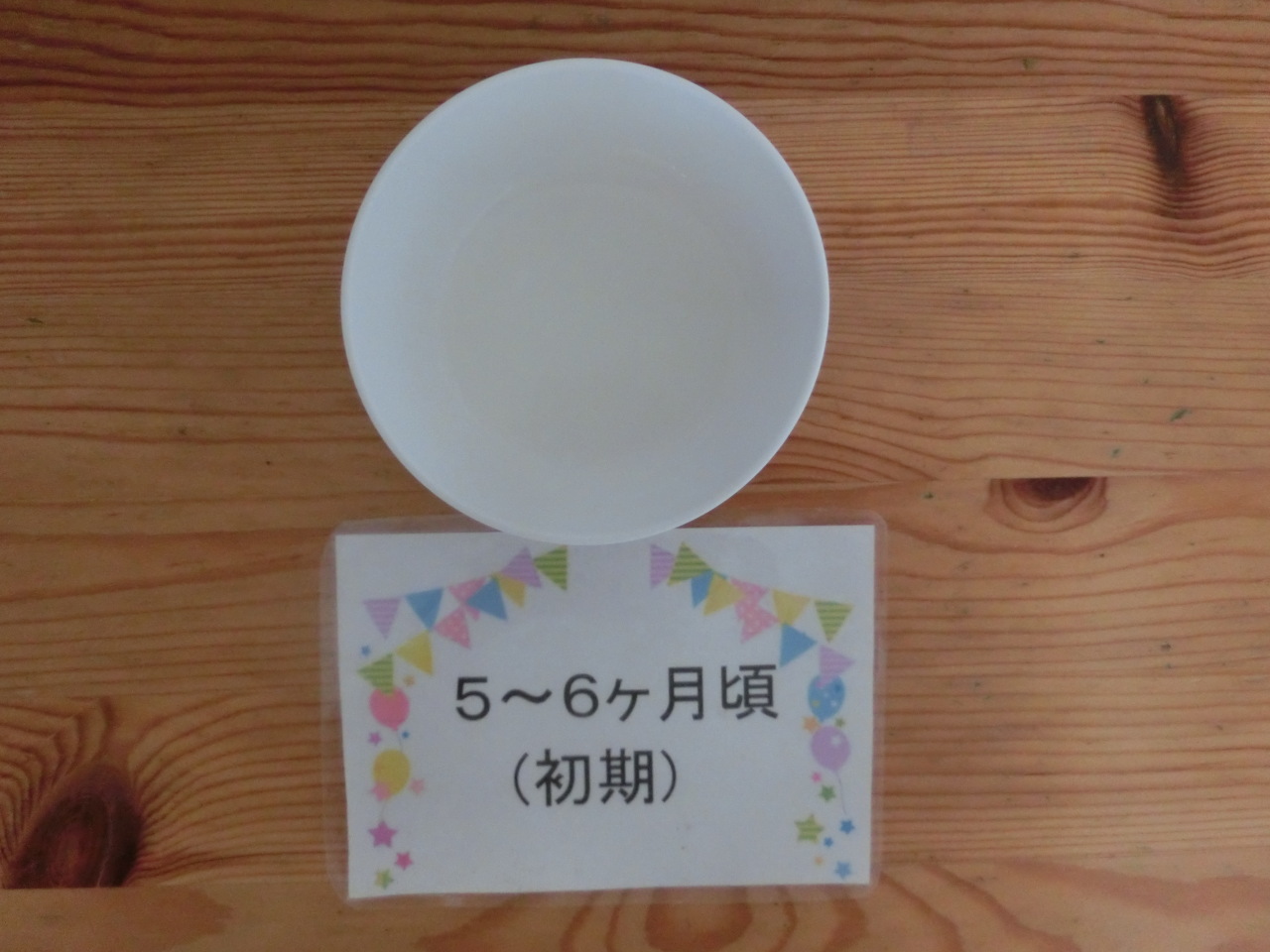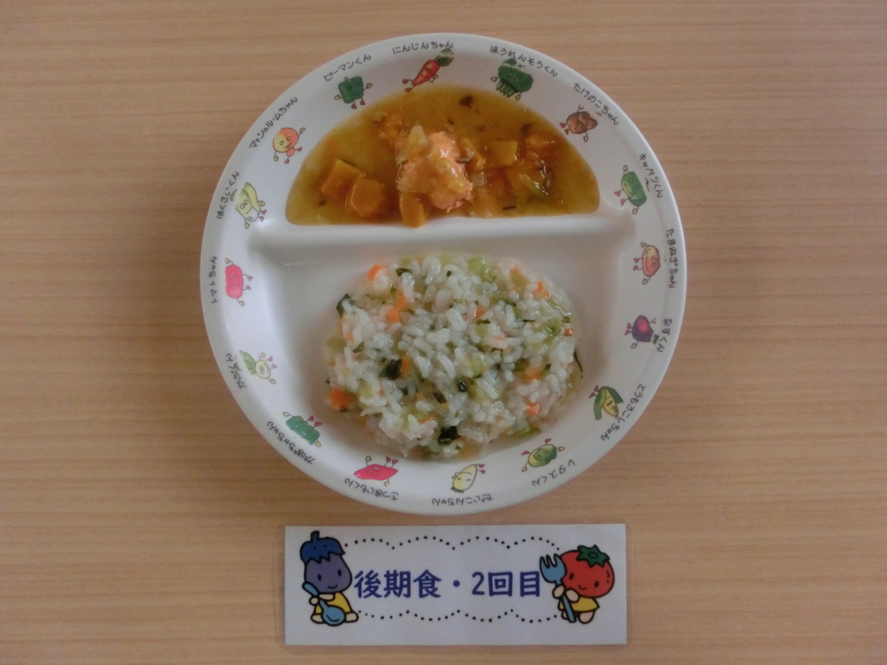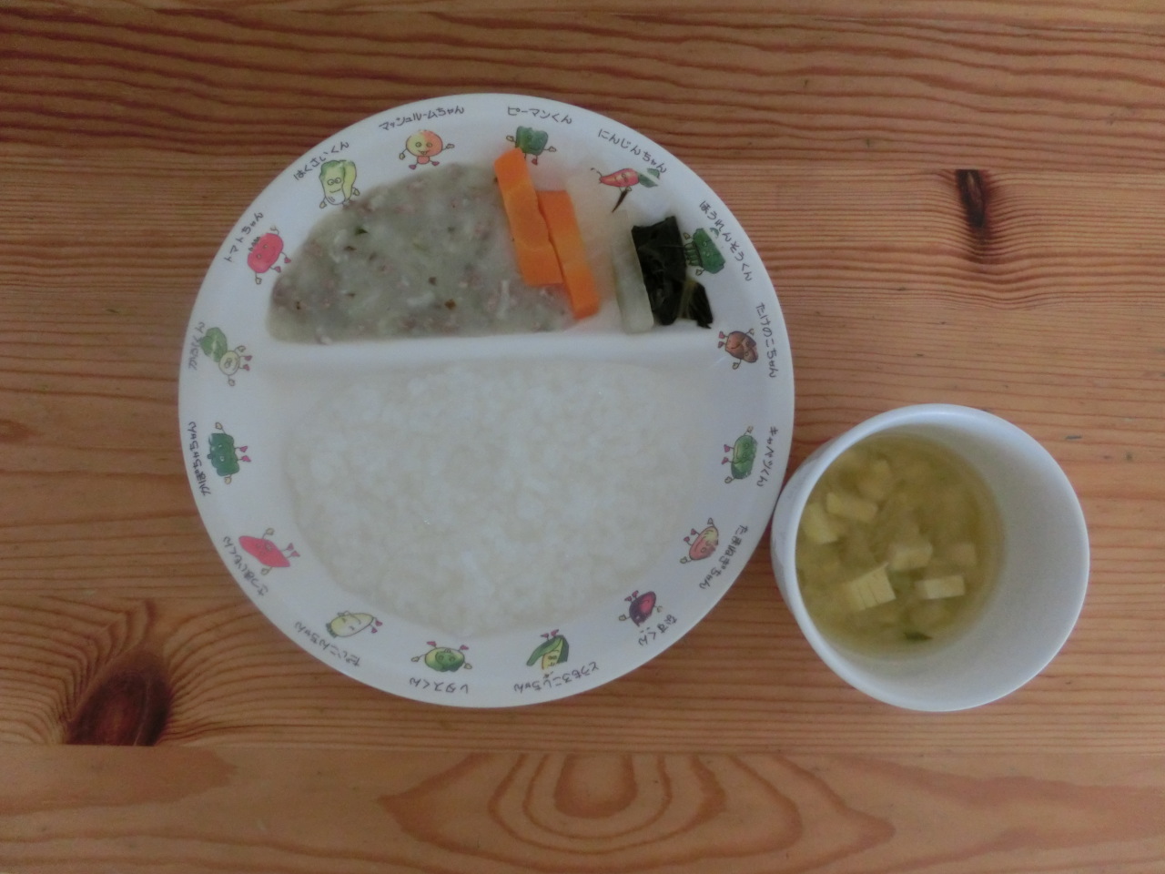 今日から初期食の提供が始まりました。初めはおもゆからです。慣れてきたらごはん粒を少し入れてドロドロに裏ごしをしたものにしていきます。今日の幼児食はレンコン入り、食物繊維やビタミンcが含まれます。すりおろして入れましたが、レンコンの食感はわかりました。