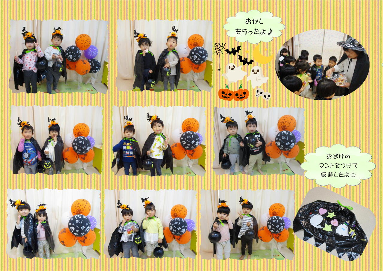 手作りのマントを身につけて、ワクワクした表情でハロウィンを迎えた子どもたち。仮装した園長先生に「トリックオアトリート」と少し恥ずかしそうに声をかけ、お菓子をもらうと笑顔があふれました。その後はみんなで写真を撮ったり、お菓子を食べたりしながら「おいしいね」「ハロウィンたのしいね」とおしゃべりを楽しんでいました(*^_^*)♪