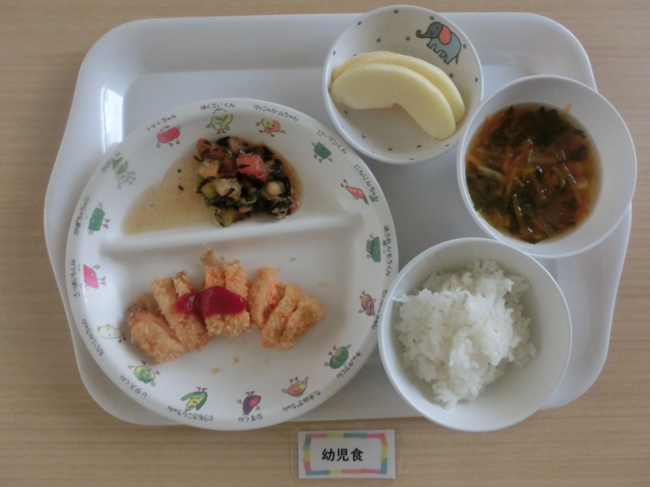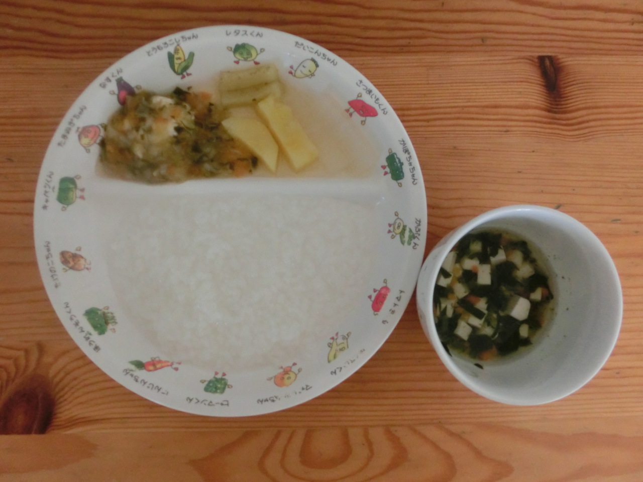 今日からきりん組ではご飯をお茶碗に入れて提供しました。お茶碗を持ってご飯を食べる練習です。まだ上手に持てるお子さんはあまりいませんが、手をお茶碗に添えて上手に食べるお子さんが何人かいました。普段はあまりご飯を食べないお子さんが今日は全部ご飯を食べることができ、嬉しい気持ちになりました。食器を変えるだけで食べる意欲につながりました。