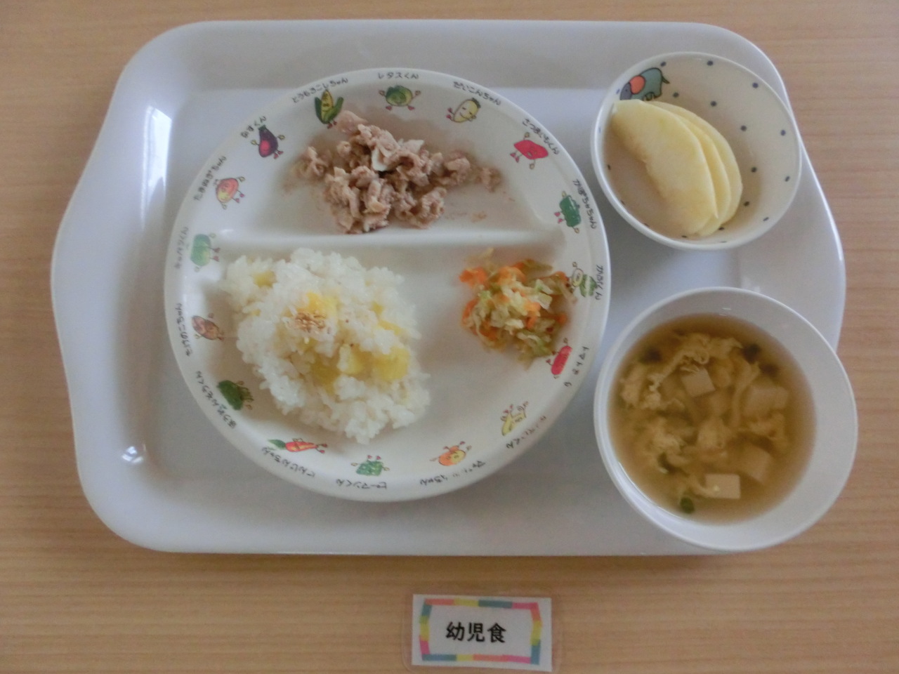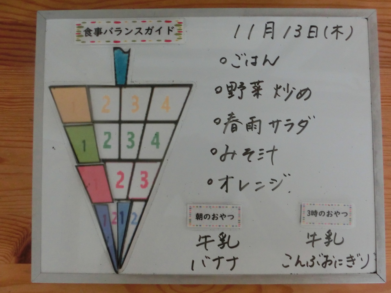 HOME 園の様子 11月14日の給食と食事バランスガイド 11月14日の給食と食事バランスガイド 2025/11/14 保育園での摂取量 今日の主食はさつま芋ごはんです。さつま芋は今が旬のお野菜で、ビタミンCもたっぷり含まれています。消化の吸収もよく食物繊維が豊富でお腹の調子も整えてくれますよ。 朝のおやつ(幼児食・アレルギー対応食) 今日の給食 今日の給食(アレルギー対応食) 離乳食(後期食) 離乳食(初期食) 3時のおやつ(幼児食とアレルギー対応食) 離乳食(後期食)2回目 炊きたてのさつま芋ごはん BACK HOME