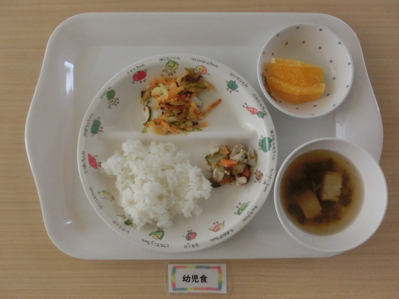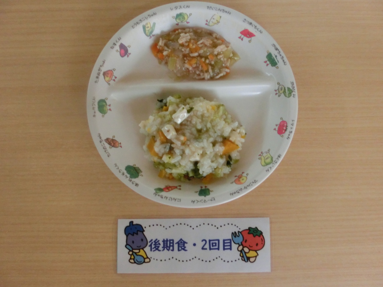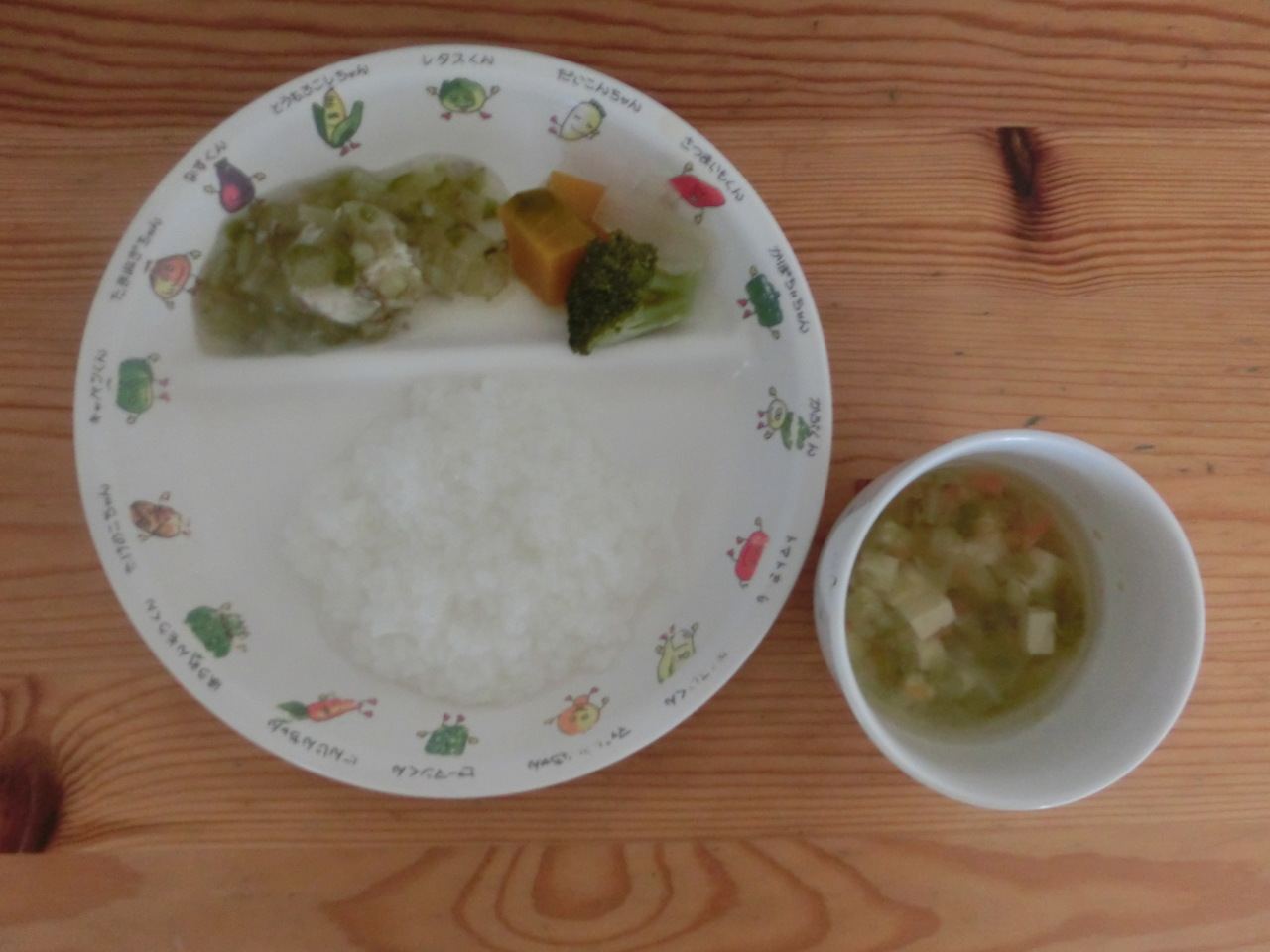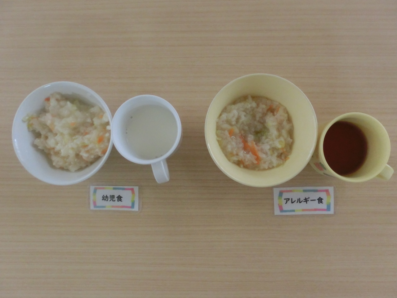 今日のおやつは洋風おじやです。白菜と人参細切りチーズを使用します。出汁でおじやを炊くので、少しのしょう油とチーズの塩味で味付けをします。白菜は冬の旬のお野菜でビタミンCを多く含み、カゼ予防、免疫力UPに効果があります。