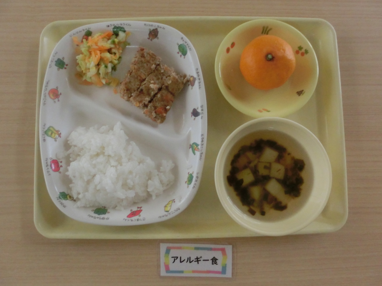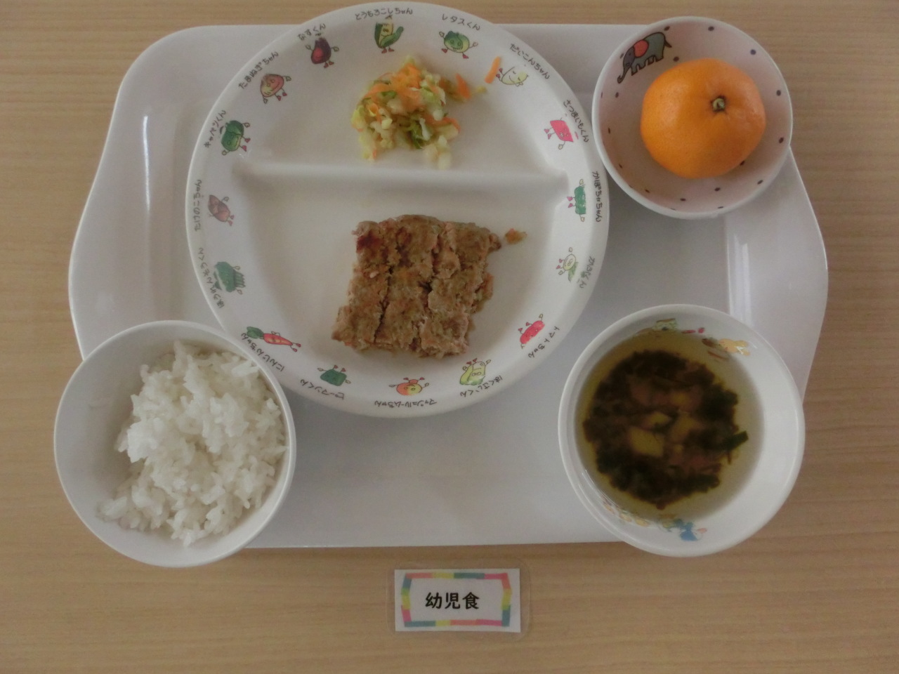 今日の主菜はお味噌で味付けした和風ミートローフです。合い挽きミンチに玉ねぎ、人参、生しいたけ、を混ぜ合わせてよくこねました。つなぎには、卵を使用せず、豆腐を使ったので卵アレルギーのあるお子さんも安心して食べられます。