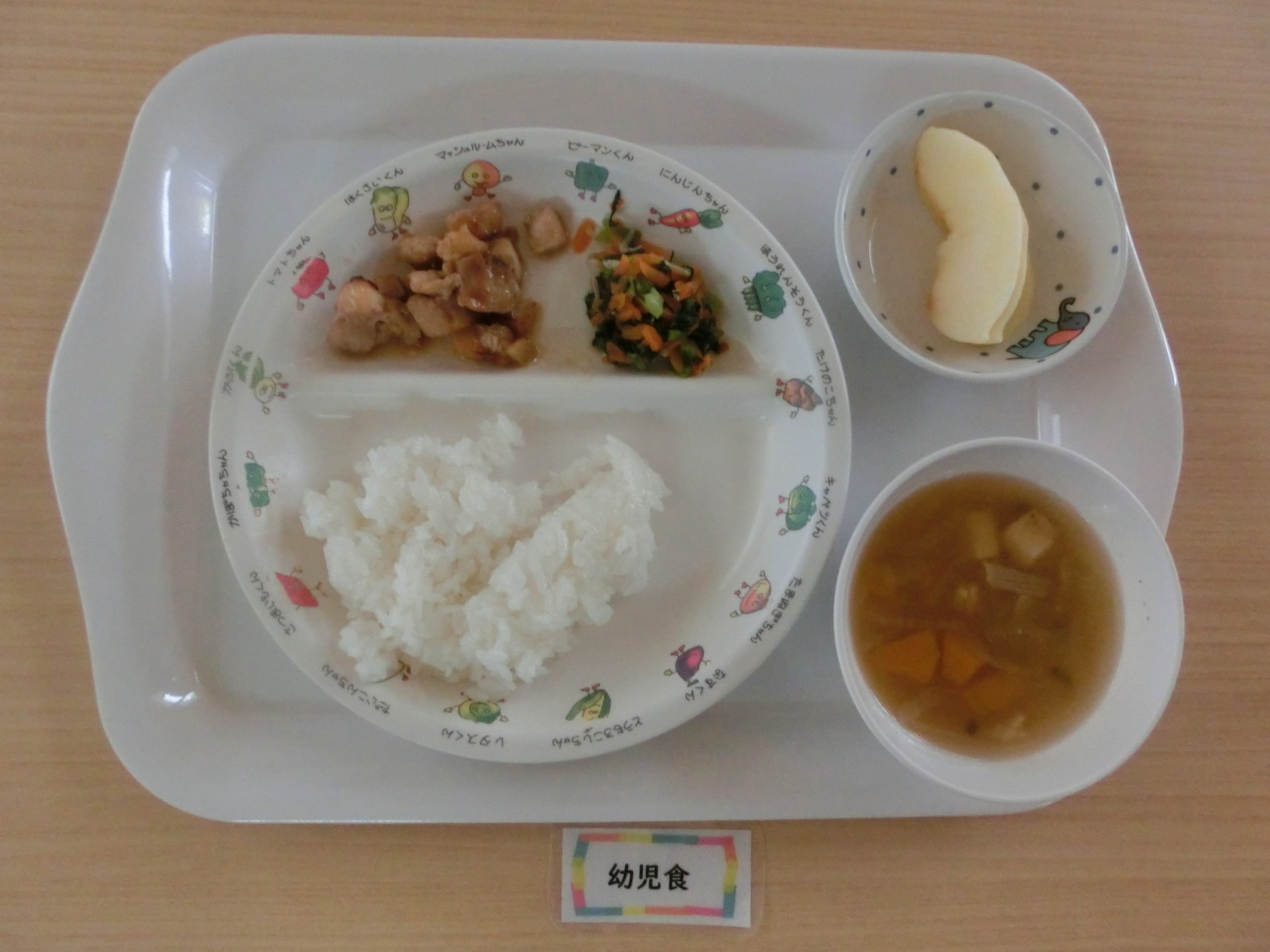 今日の副菜は小松菜の和え物です。小松菜、しらす、人参を使用しています。小松菜はビタミンCが豊富で寒い時期にはぴったりの食材です。また、しらすに含まれるビタミンDを一緒にとることで、野菜に含まれるカルシウムの吸収率がアップしますよ。