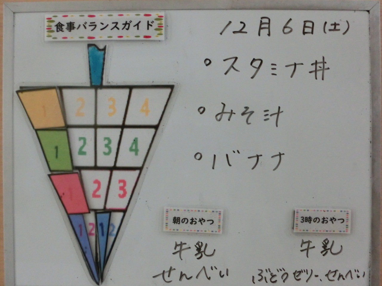 HOME 園の様子 12月6日の給食と食事バランスガイド 12月6日の給食と食事バランスガイド 2025/12/08 保育園での摂取量 今日の給食はスタミナ丼でした。お肉は子どもにとっても、なんといっても元気の源!野菜もたくさん一緒に炒めて子どもたちにたくさん食べてもらいました。簡単に作れて栄養満点です! 朝のおやつ 今日の給食 3時のおやつ BACK HOME