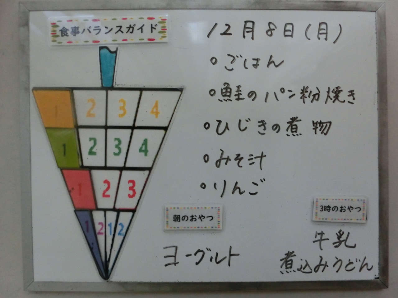 HOME 園の様子 12月8日の給食と食事バランスガイド 12月8日の給食と食事バランスガイド 2025/12/08 保育園での摂取量 今日のおやつは煮込みうどんです。出汁のいい香りが調理室いっぱいに広がります。煮干し、かつお、昆布でしっかりと出汁をとっているので、しょう油は少量で味付けをします。寒い日にぴったりのおやつです。 朝のおやつ 今日の給食 今日の給食(アレルギー対応食) 離乳食(初期食) 3時のおやつ(幼児食・アレルギー対応食) BACK HOME