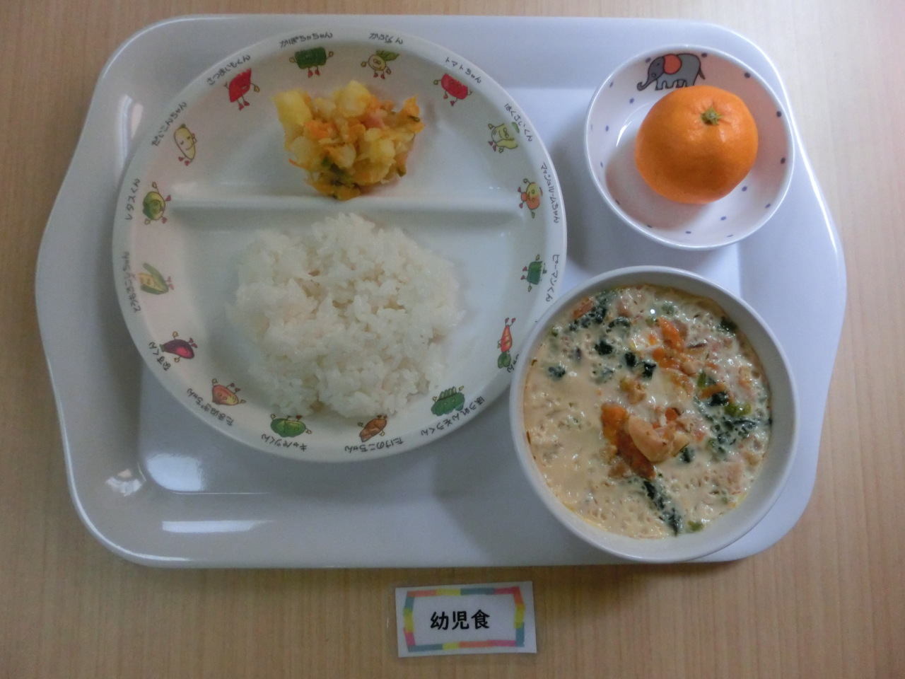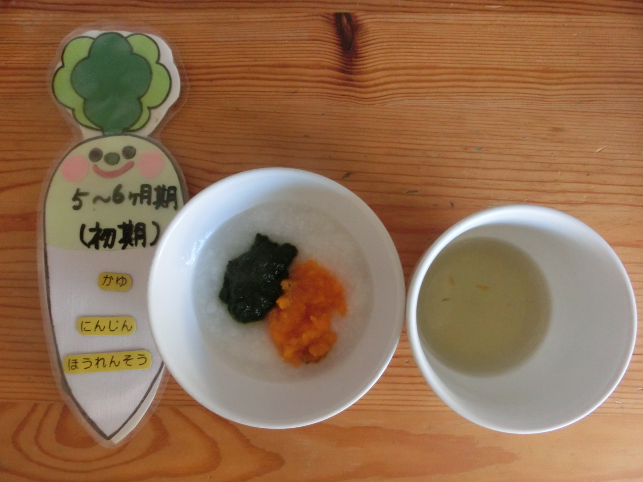 初期食はご家庭で食べられたお野菜をお聞きして、絵Bでも提供します、12月12日は人参とほうれん草です。昆布だしでやわらかく炊いてから裏ごししています。