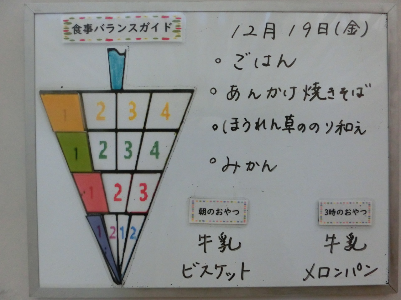 HOME 園の様子 12月19日の給食と食事バランスガイド 12月19日の給食と食事バランスガイド 2025/12/19 保育園での摂取量 今日のメニューはあんかけ焼きそばです。野菜をたくさん使って豚肉と一緒に炒め、あんにしています。和風の味のあんかけですが、子どもたちはよく食べてくれました。 朝のおやつ 今日の給食 今日の給食(アレルギー対応食) 離乳食(初期食) 3時のおやつ(幼児食・アレルギー対応食) BACK HOME